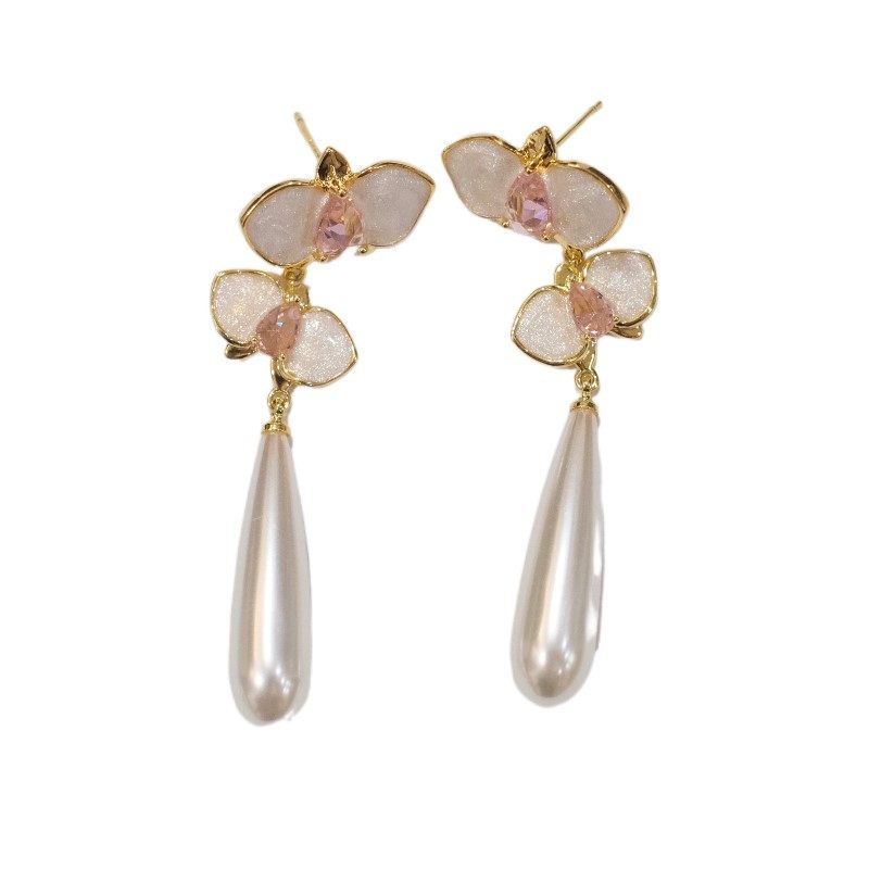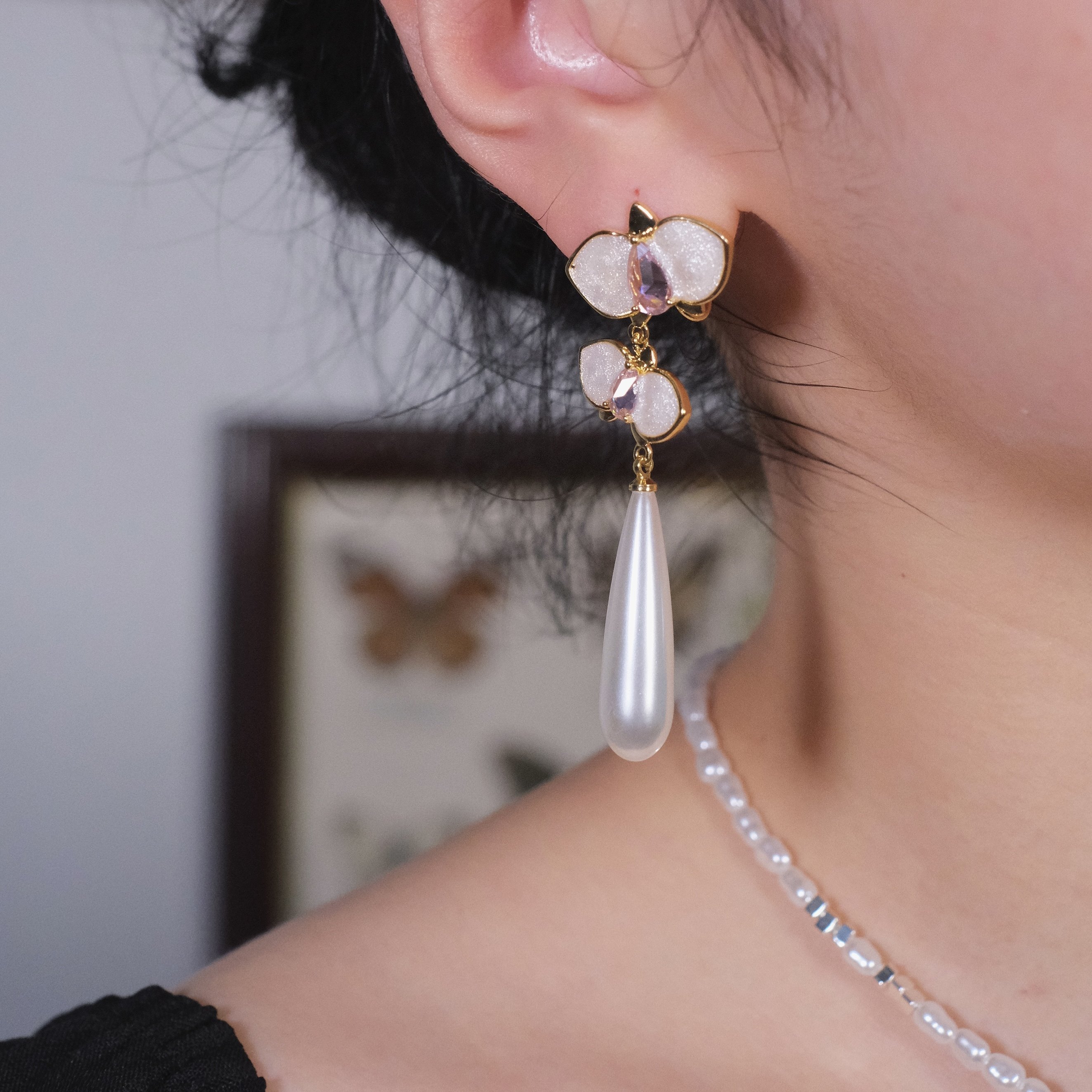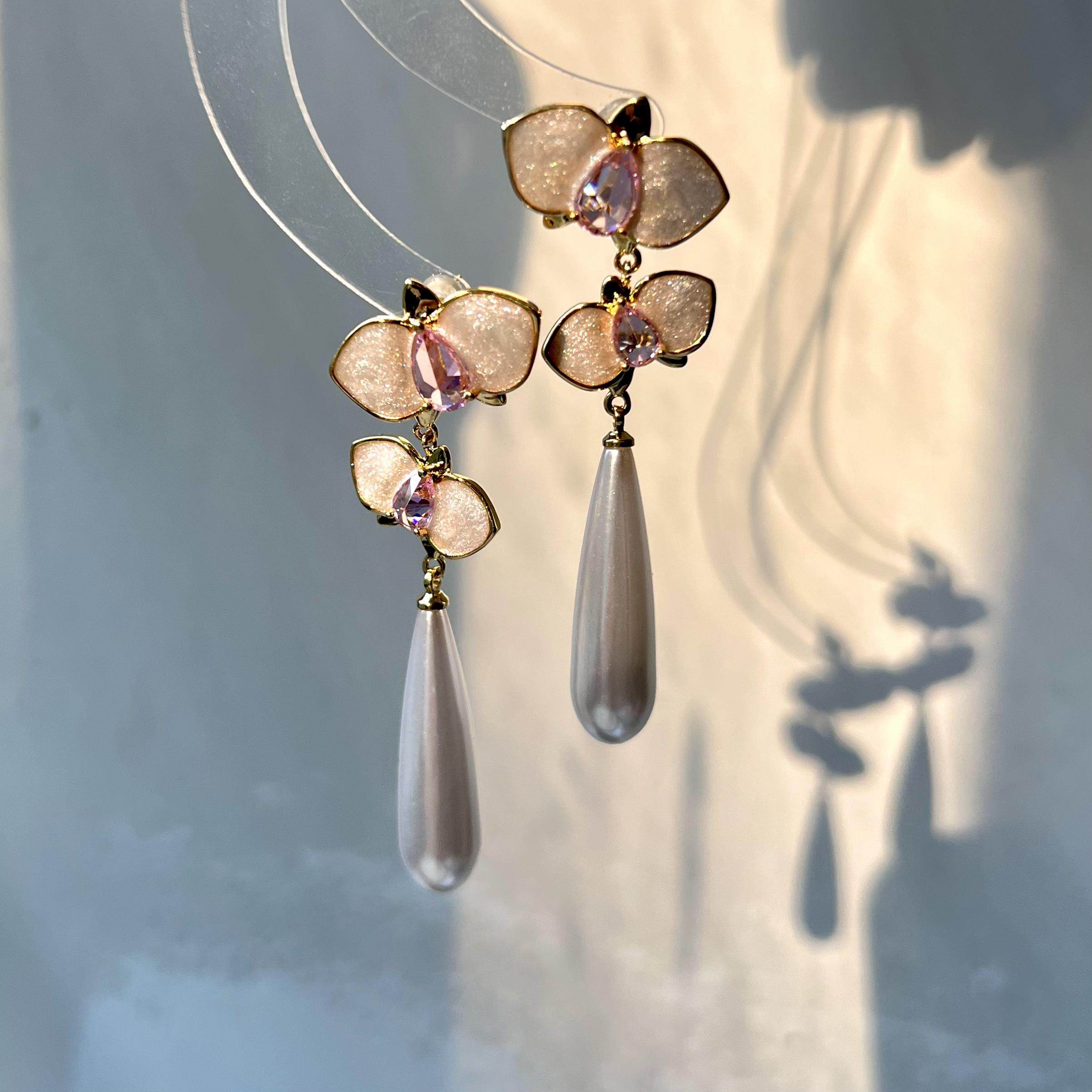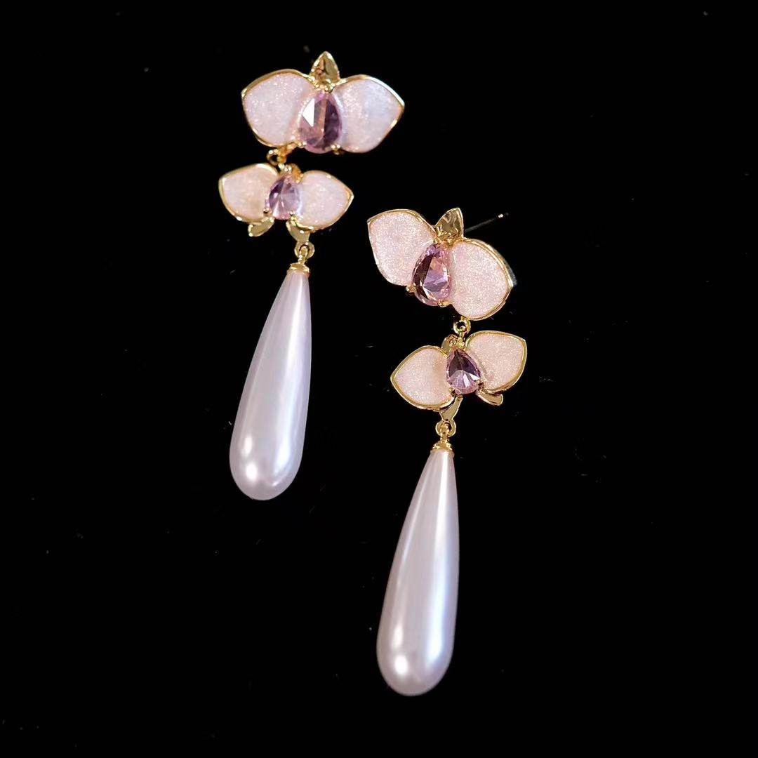 《蝴蝶兰》复古新中式高级感独特珐琅滴釉长款珍珠耳环耳夹耳坠女