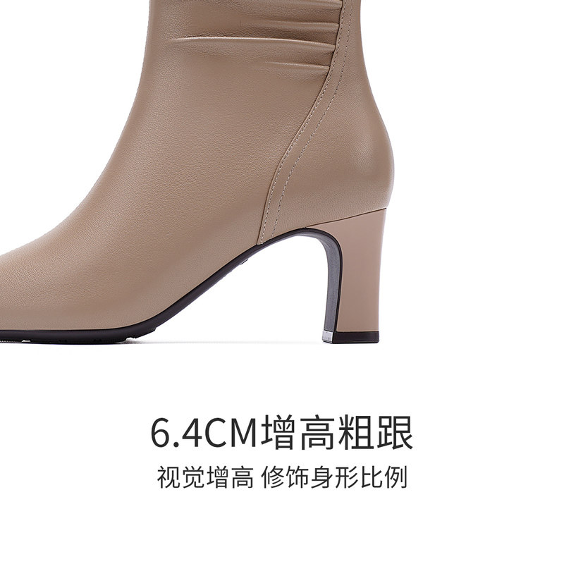 羊皮版~内增高靴子女2025新款爆款中筒粗跟短靴卡其色褶皱堆堆靴