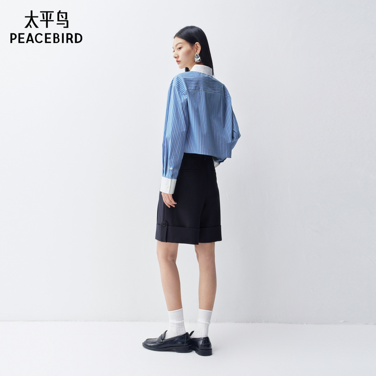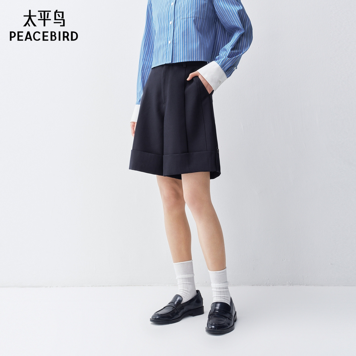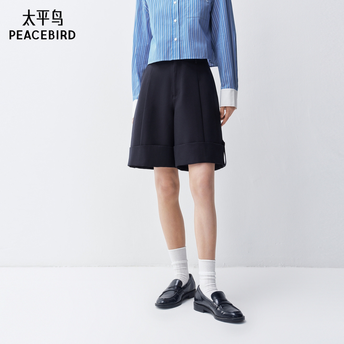 太平鸟夏季新款高腰阔腿藏蓝休闲通勤短裤女
