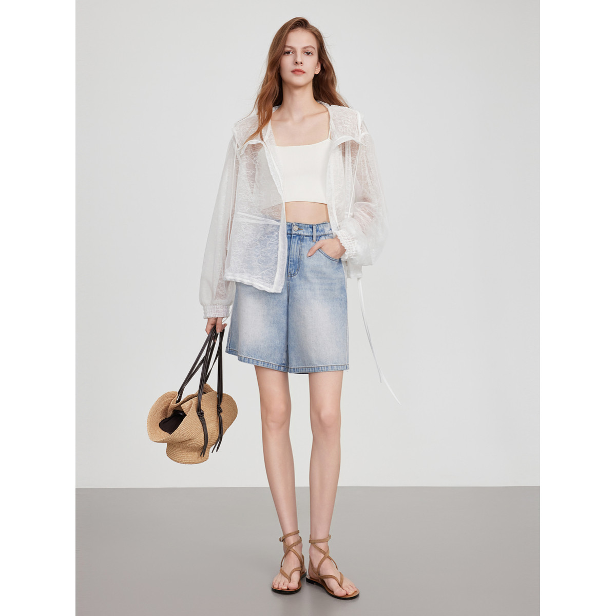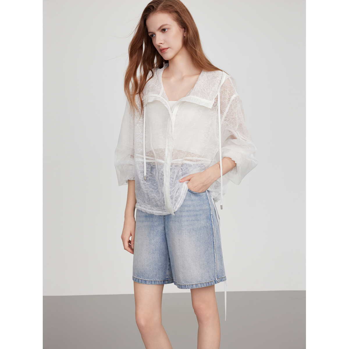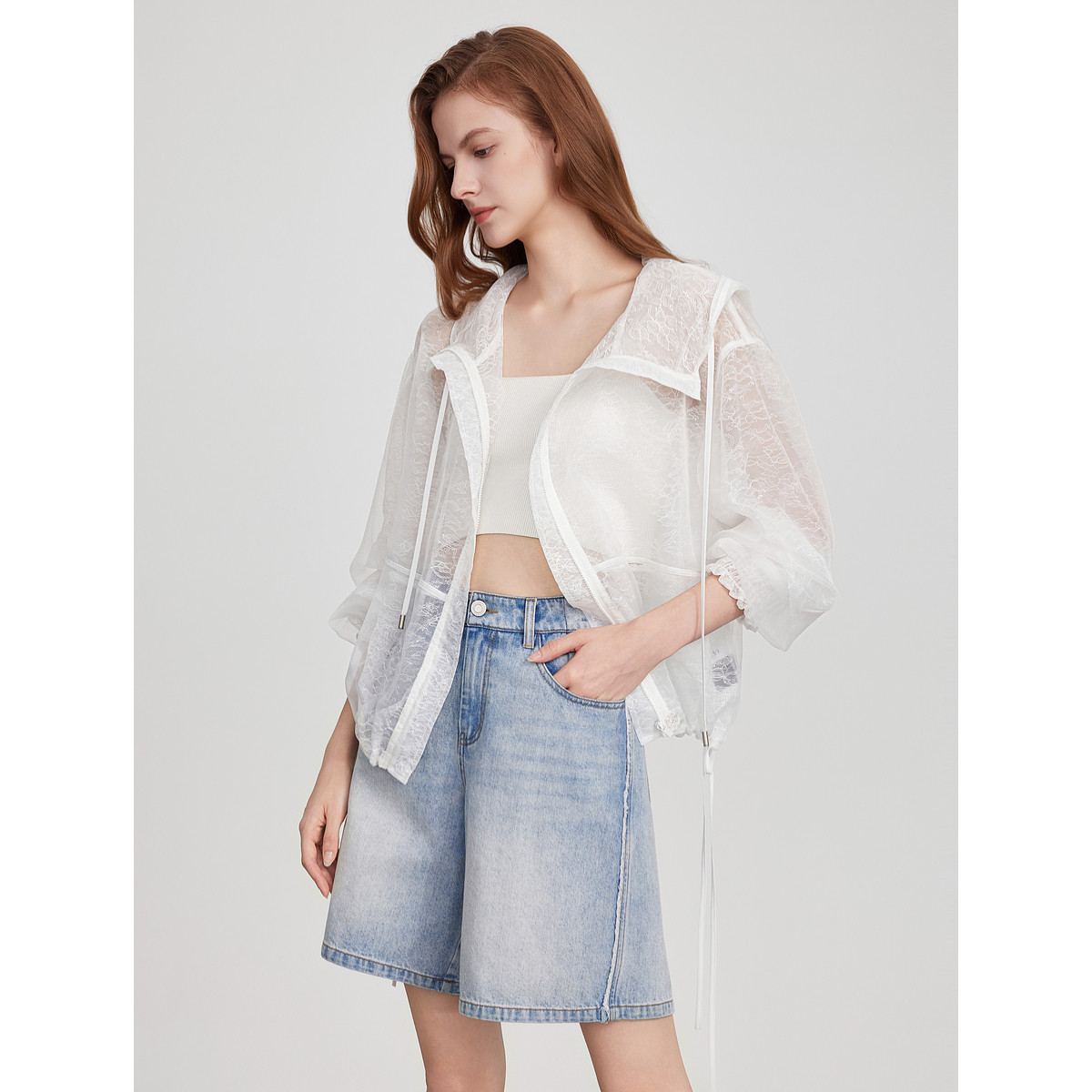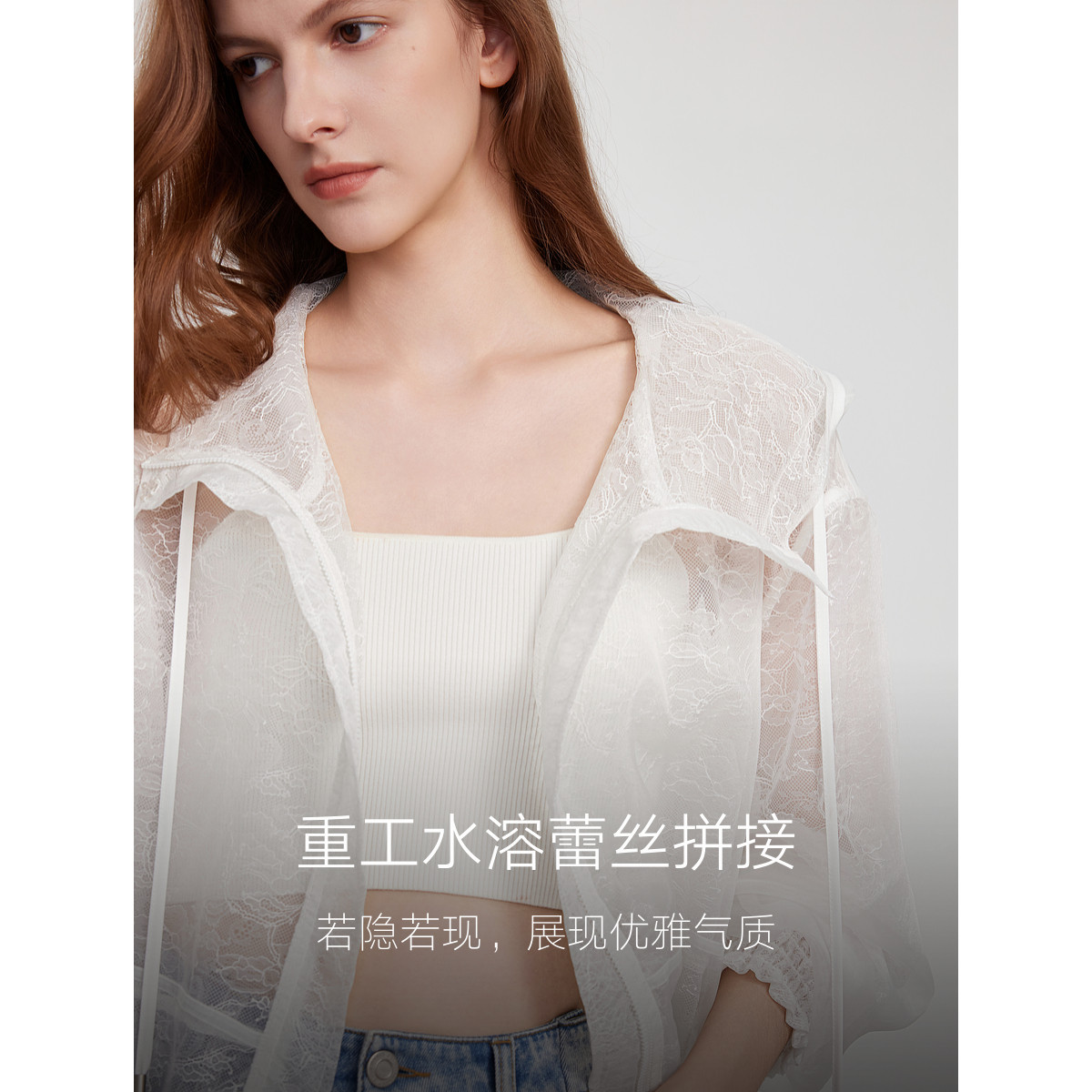 ELLE白色重工蕾丝拼接短外套女2025夏新款宽松时髦设计感轻薄上衣