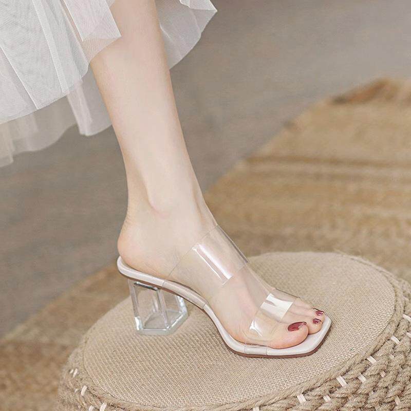 凉鞋女夏季平底2025新款软皮时尚水晶透明高跟鞋女凉拖鞋外穿粗跟