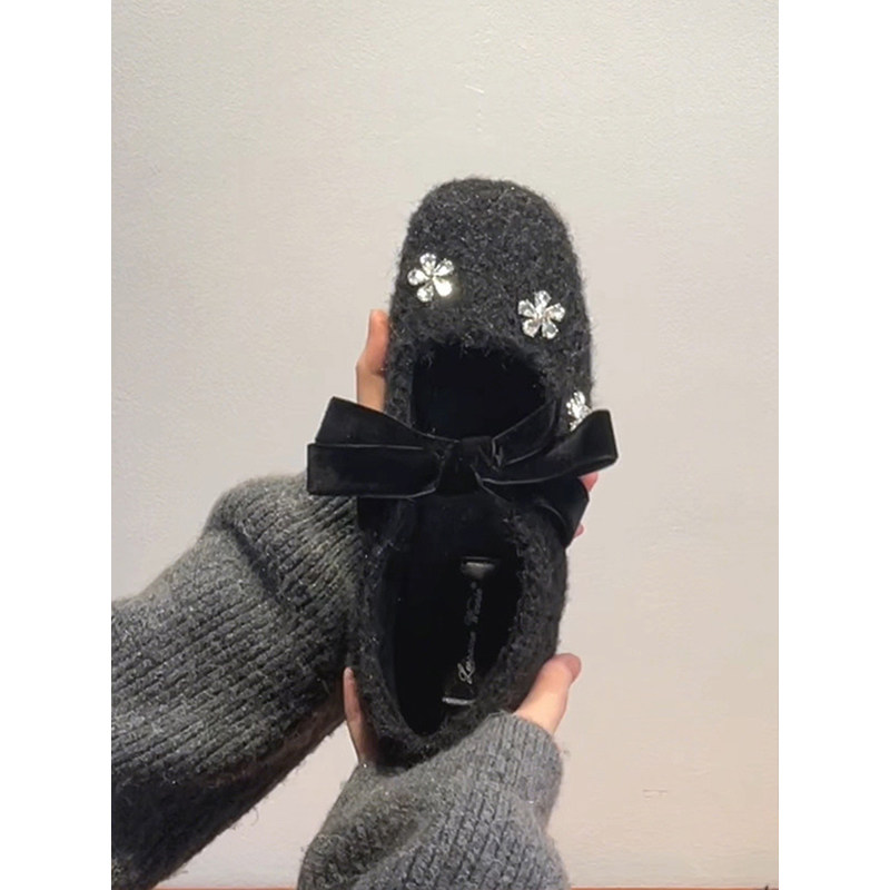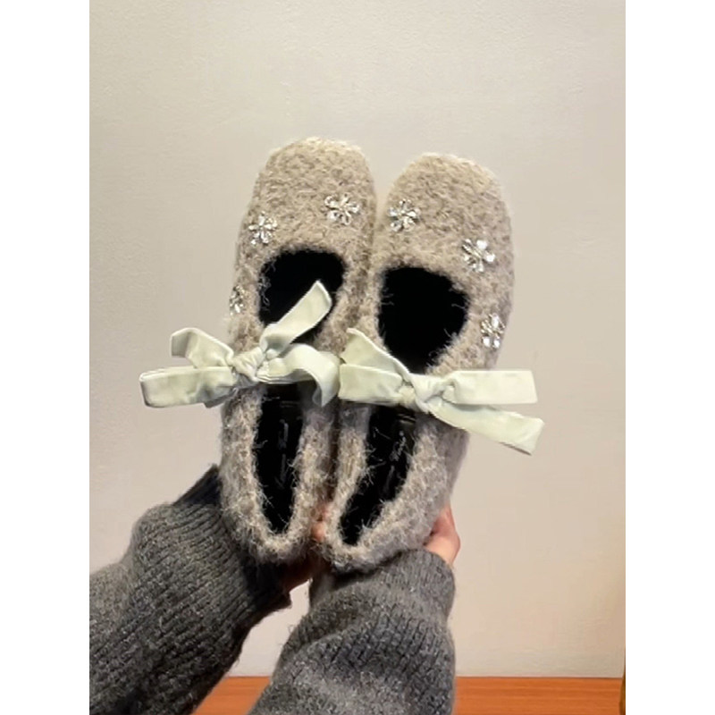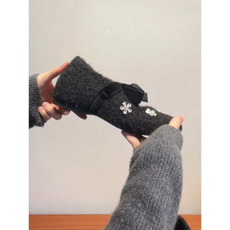 羊皮版复古玛丽珍鞋女方头秋冬季加绒保暖毛毛棉鞋平底晚晚单鞋女