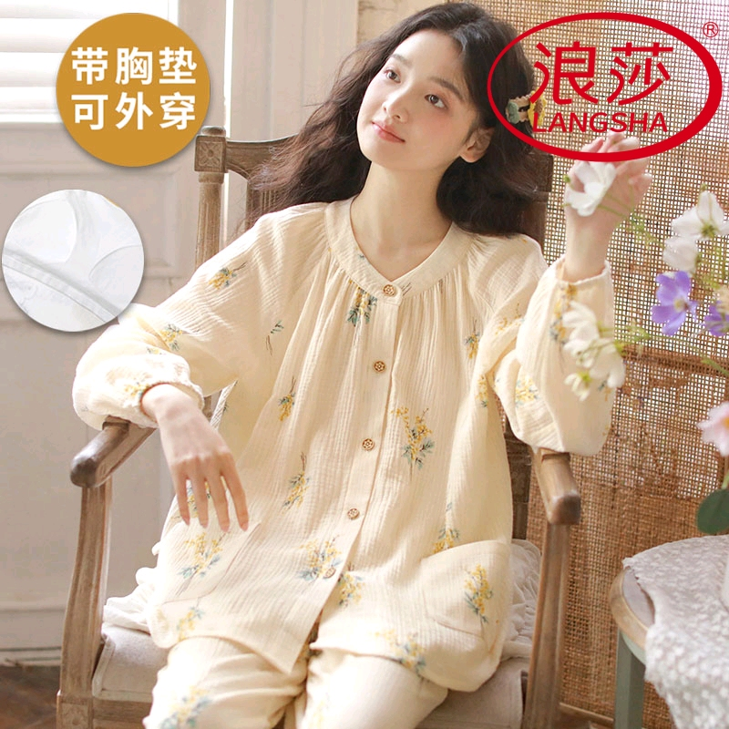 浪莎纯棉带胸垫睡衣女春秋季长袖长裤薄款韩式家居服可外穿两件套