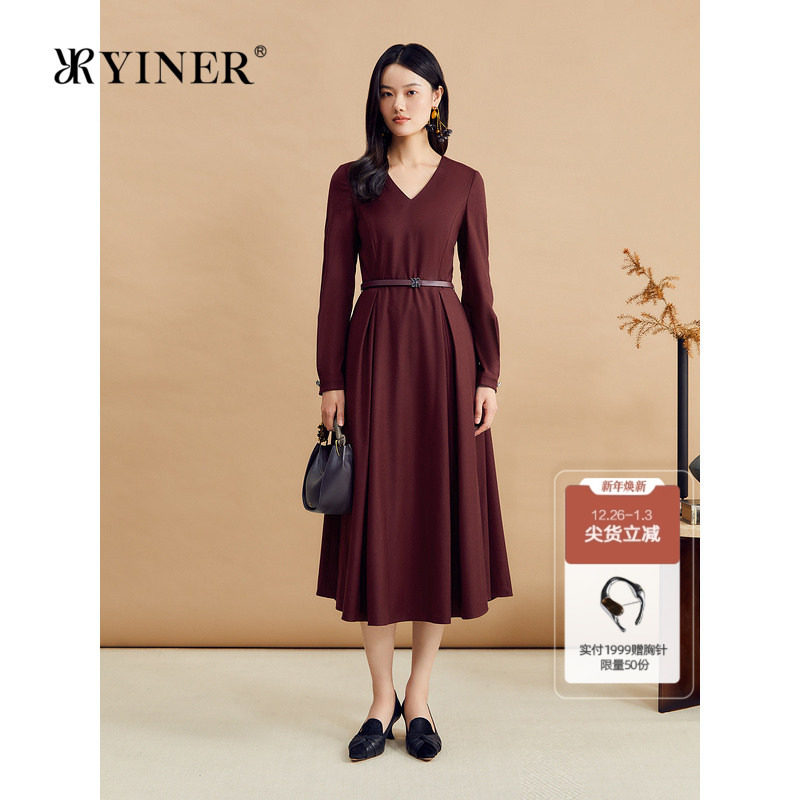 YINER音儿女装冬季法式微醺感安可拉红V领丝光羊毛收腰连衣裙