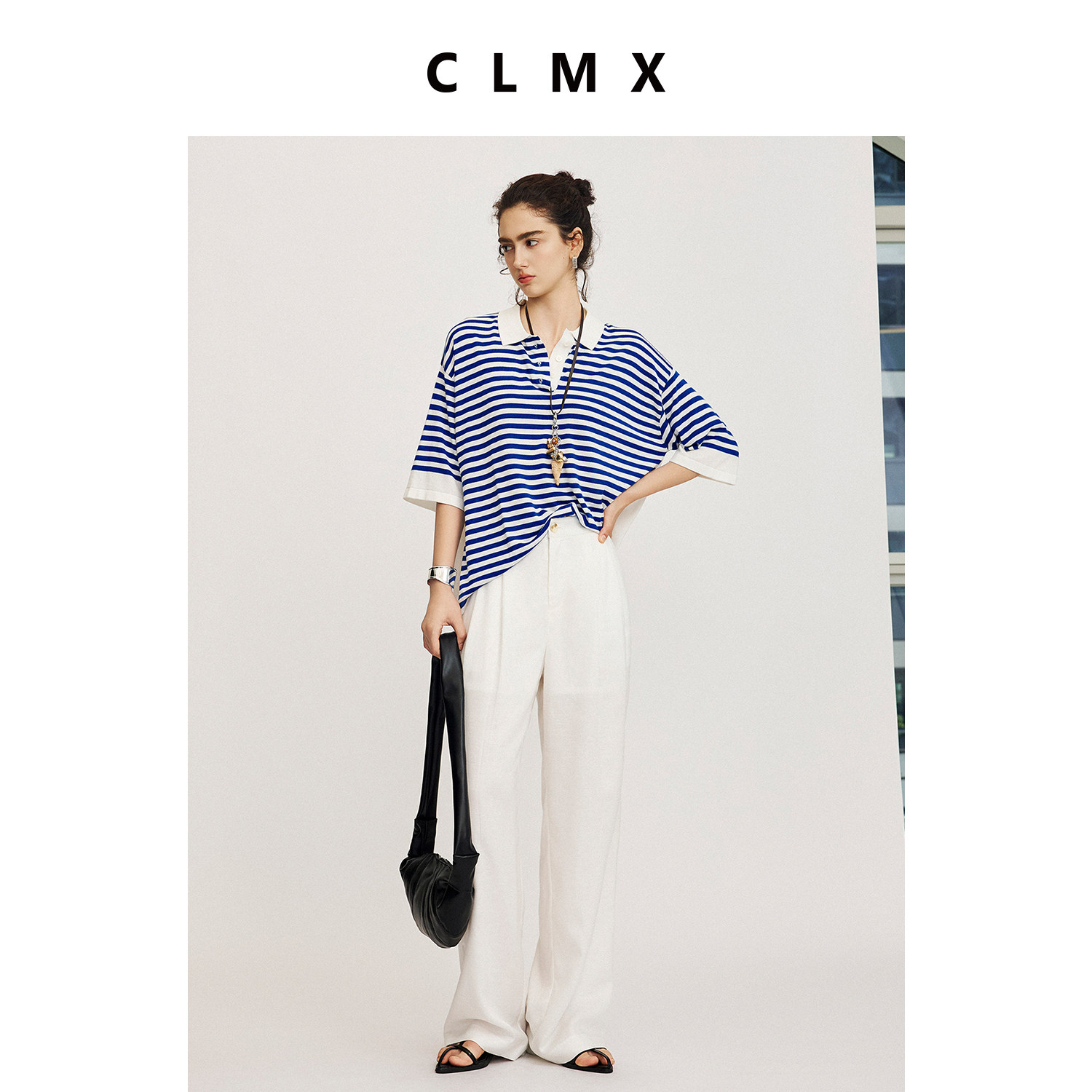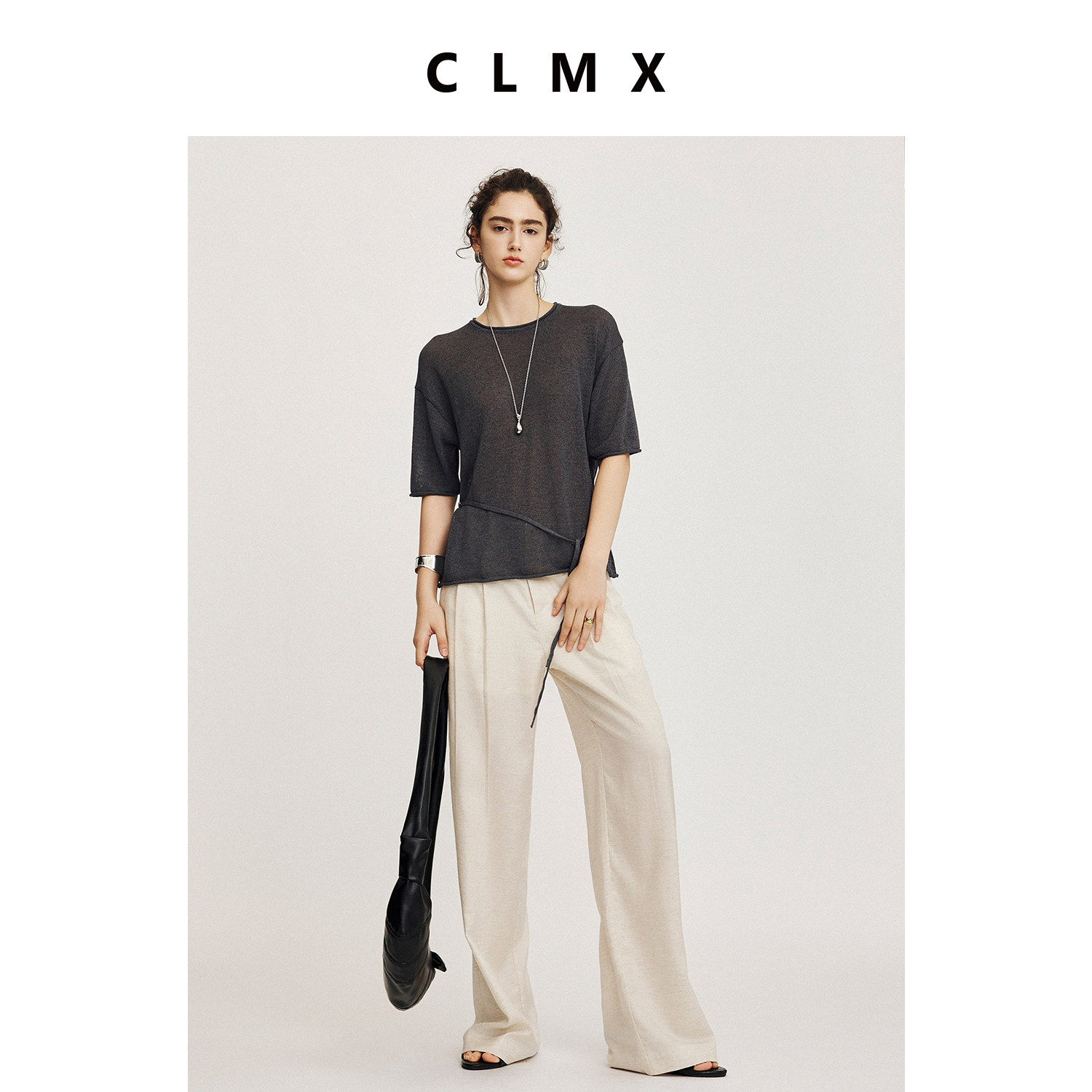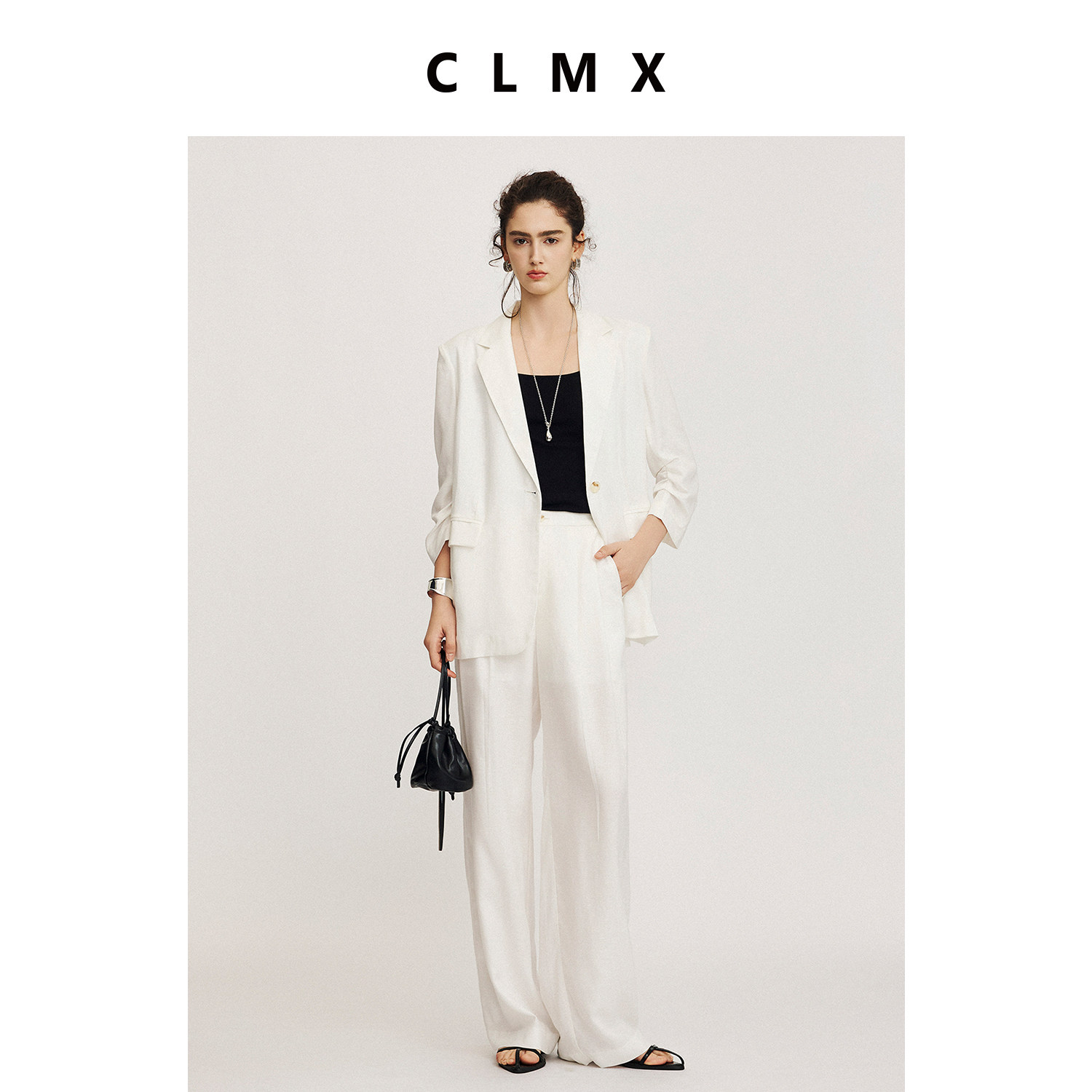 CLMX纯色休闲两件套莱赛尔亚麻混纺七分袖西装外套/腰拼接阔腿裤