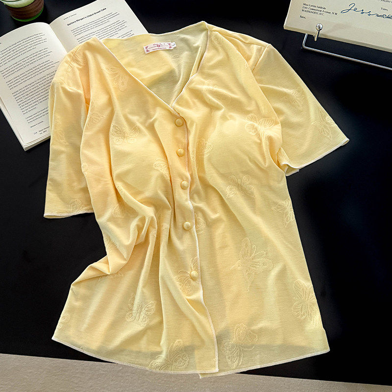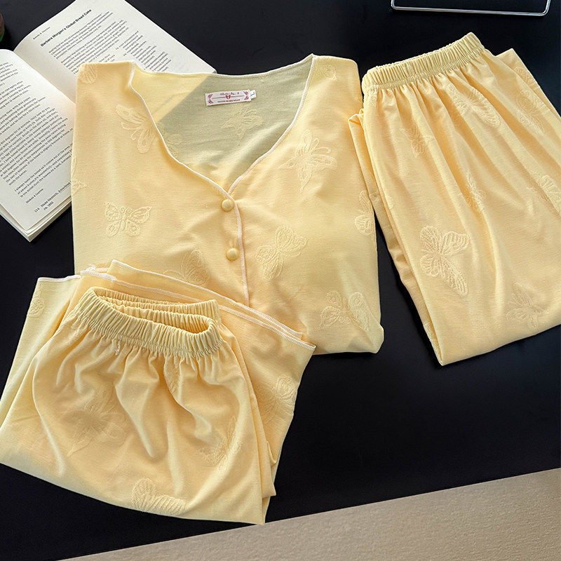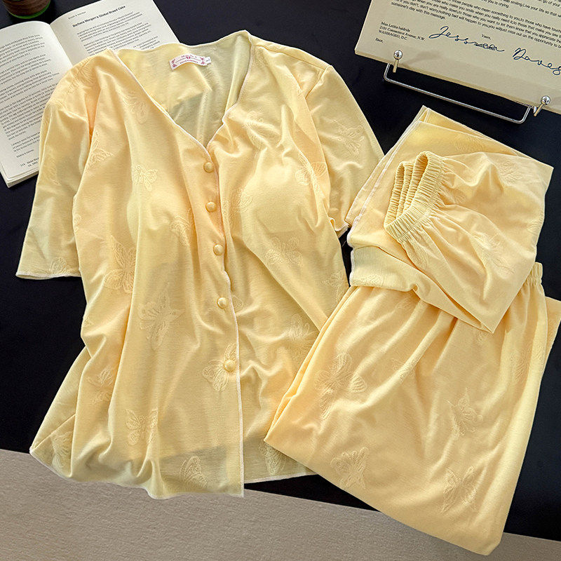 红豆莫代尔棉带胸垫睡衣女春秋夏季长袖性感v领短袖长裤三件套家