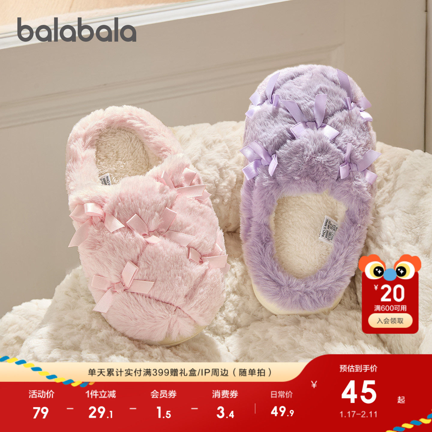 巴拉巴拉儿童棉拖鞋女童宝宝2025新秋冬棉鞋加绒室内家居鞋蝴蝶结