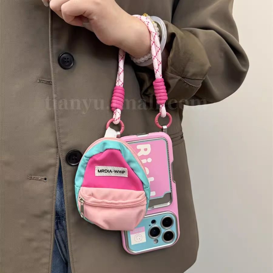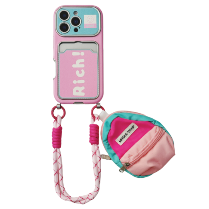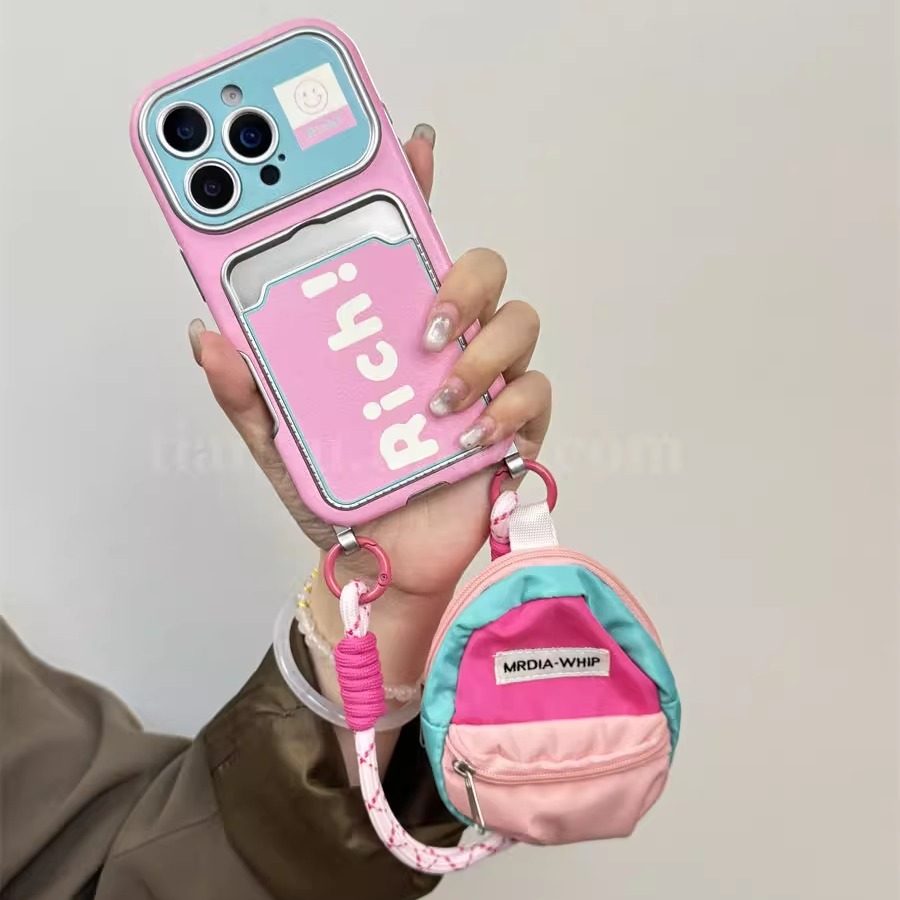 恬妤 韩风粉色Rich英文卡包适用于苹果16pro手机壳iphone13书包挂件15promax可爱15旅游斜挎绳14pro皮质13pm