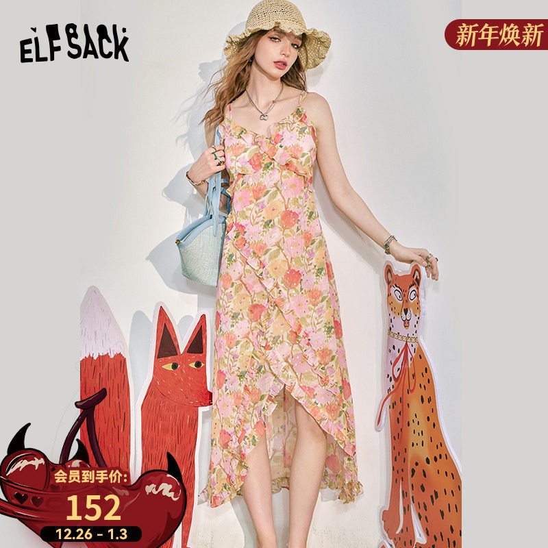 妖精的口袋木耳边开叉碎花吊带连衣裙女2025夏新款显瘦度假风裙子