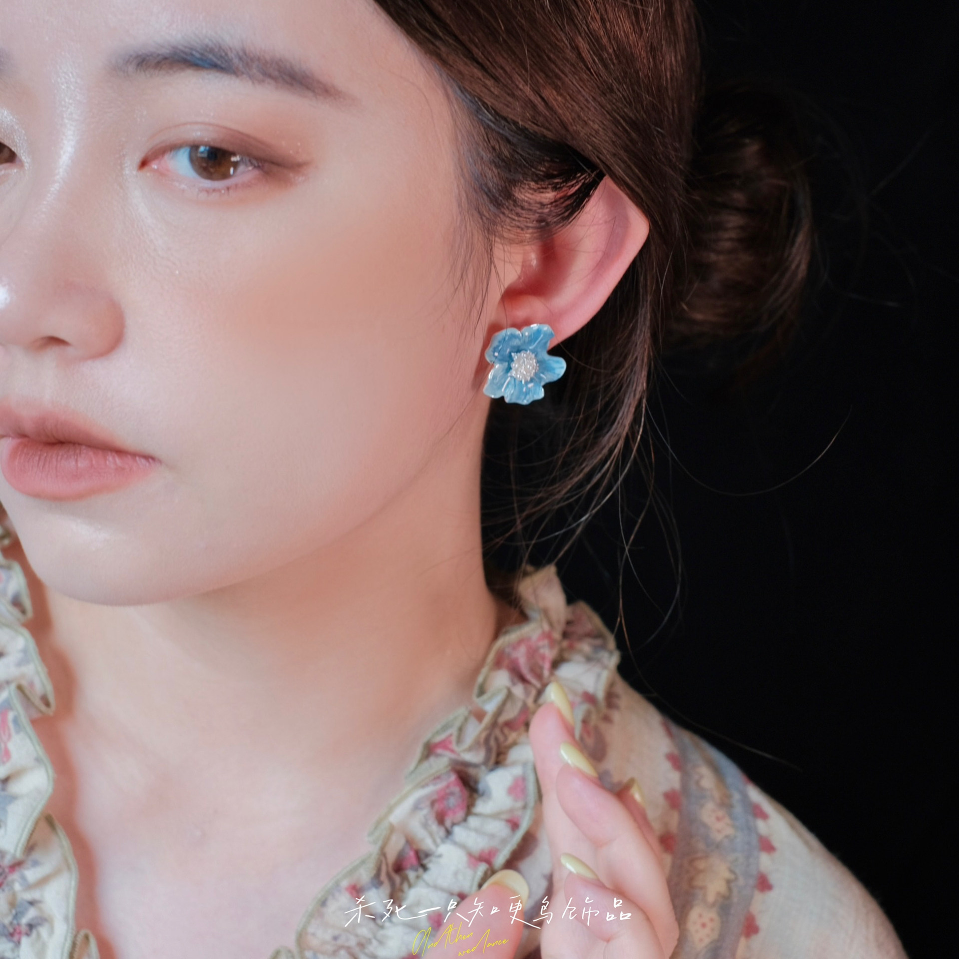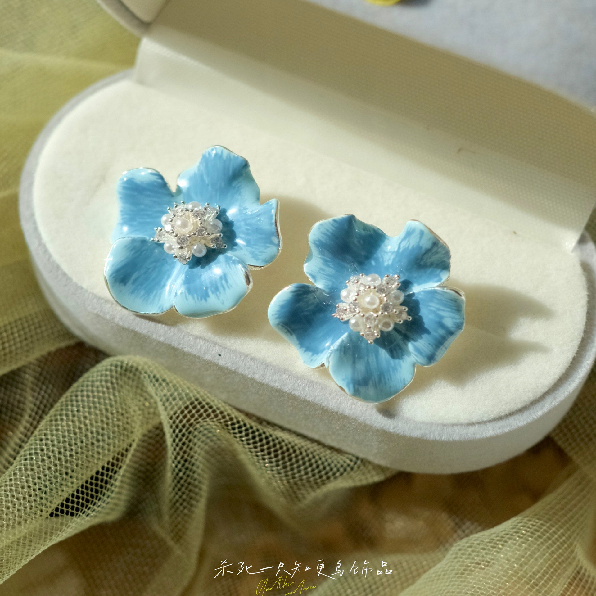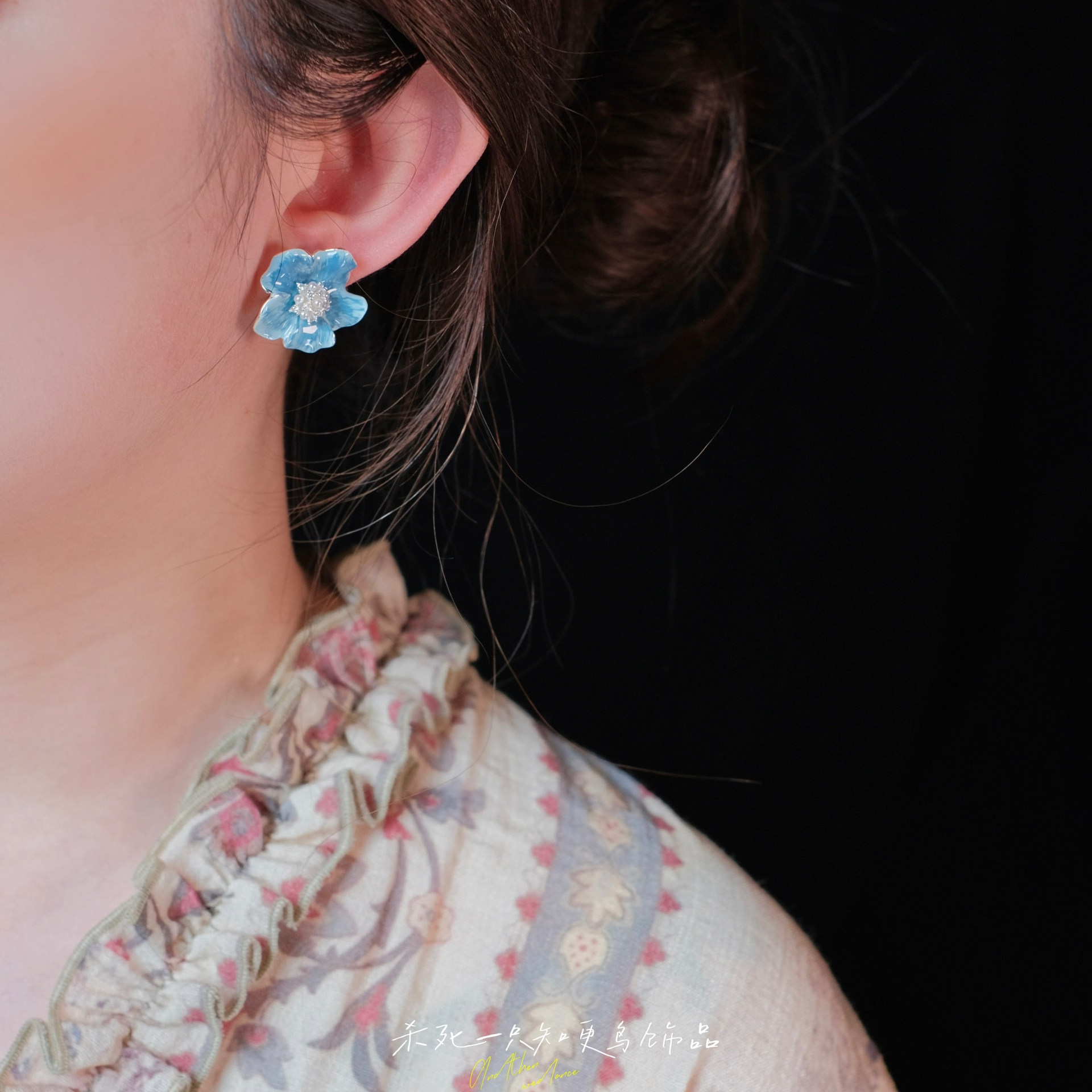 《花开半夏》超仙文艺复古清冷感蓝色珐琅釉手绘花朵耳钉耳环耳夹