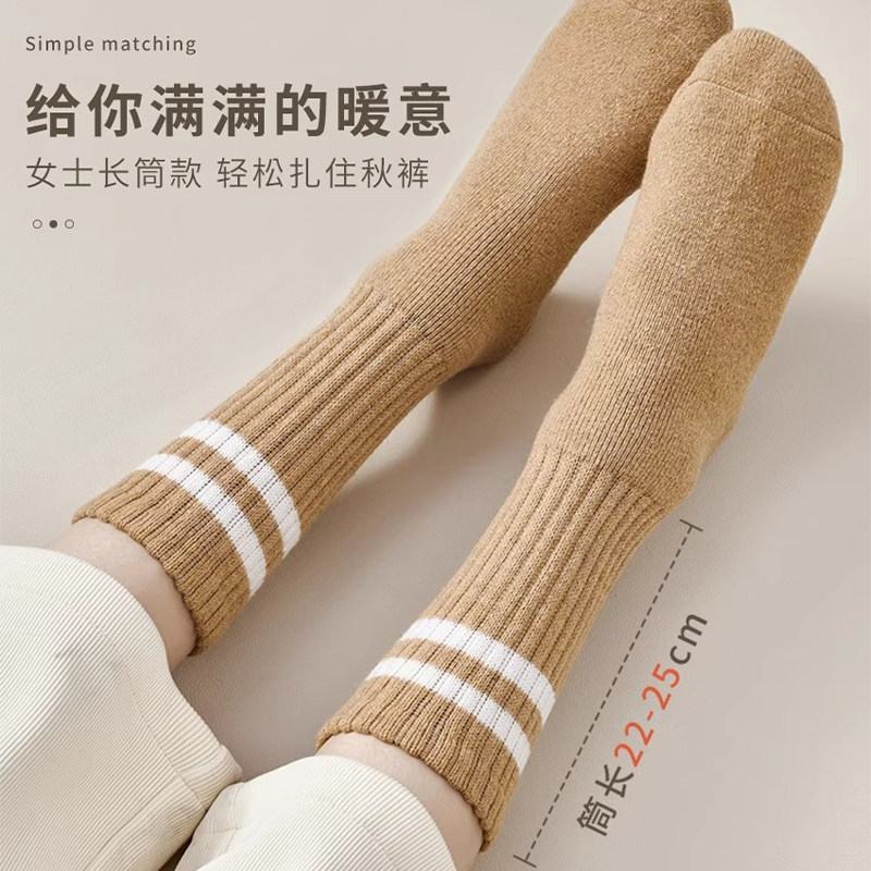 鹿人女袜秋冬款纯棉高筒袜舒适简约撞色新疆长绒棉条纹长袜女3129