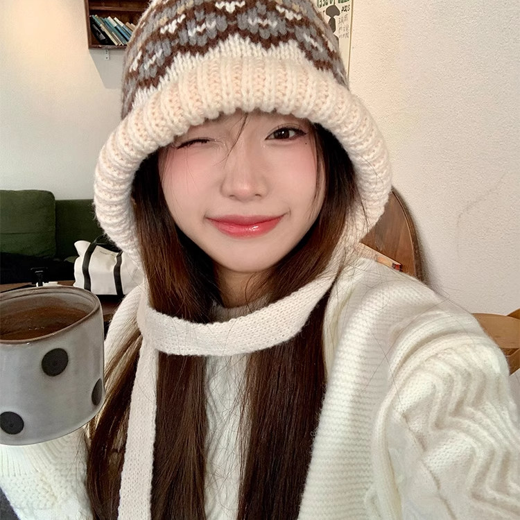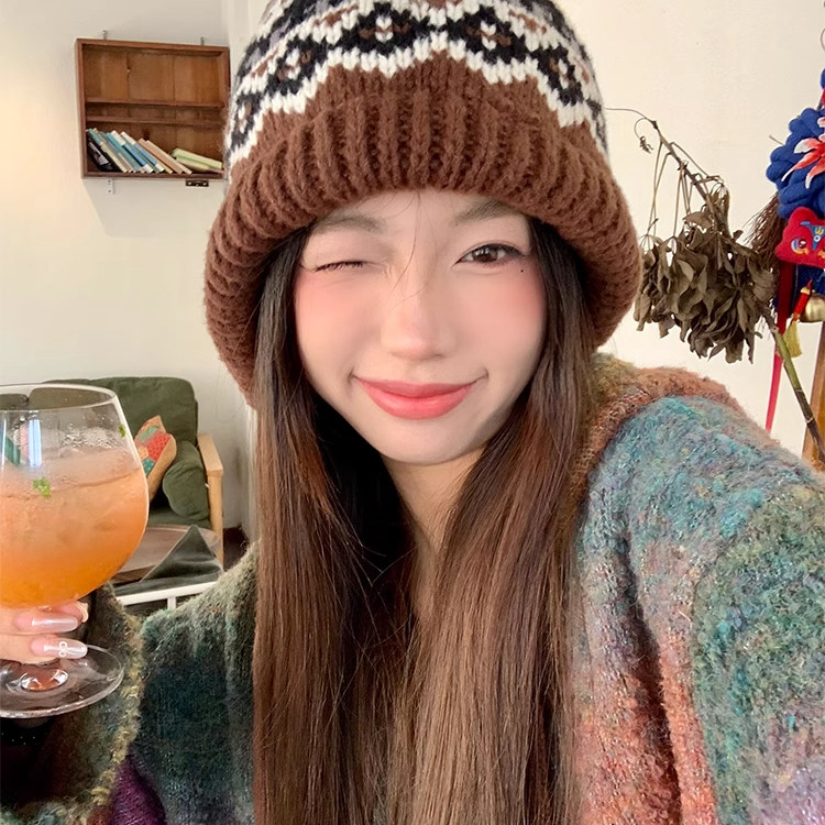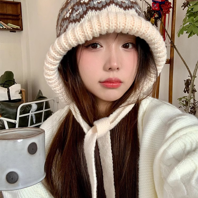 费尔岛风针织毛线帽子女冬季羊毛新款复古包包帽保暖护耳潮