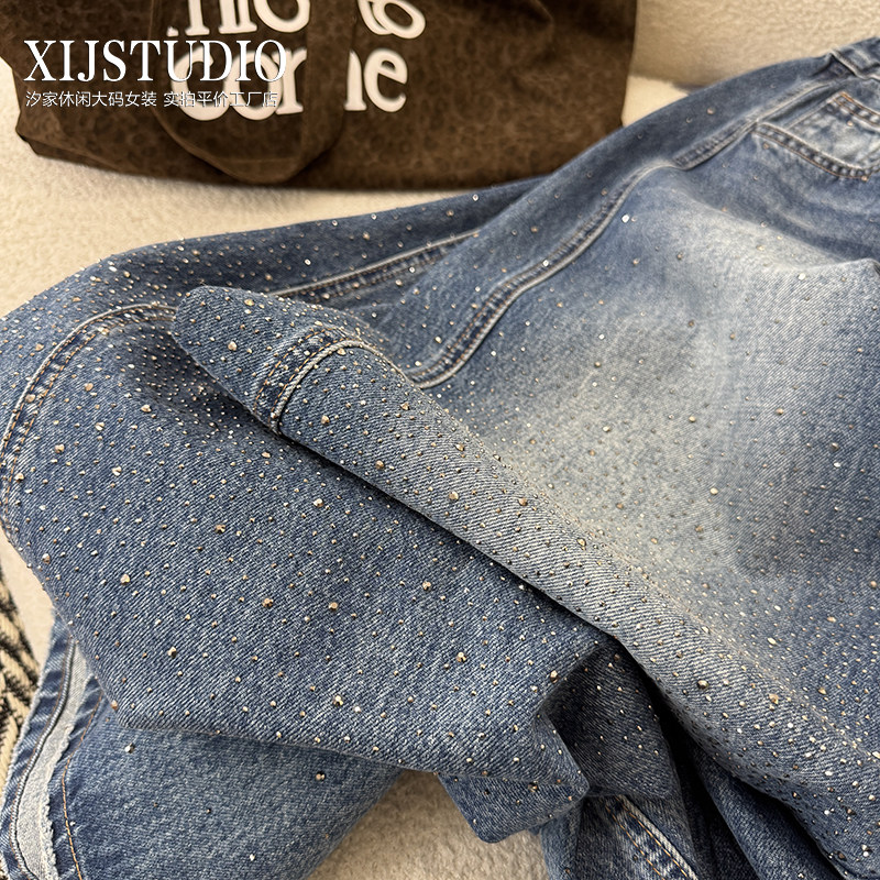 汐家女裤 满天星河爆款我烫钻阔腿裤女大码春季新款宽松牛仔裤