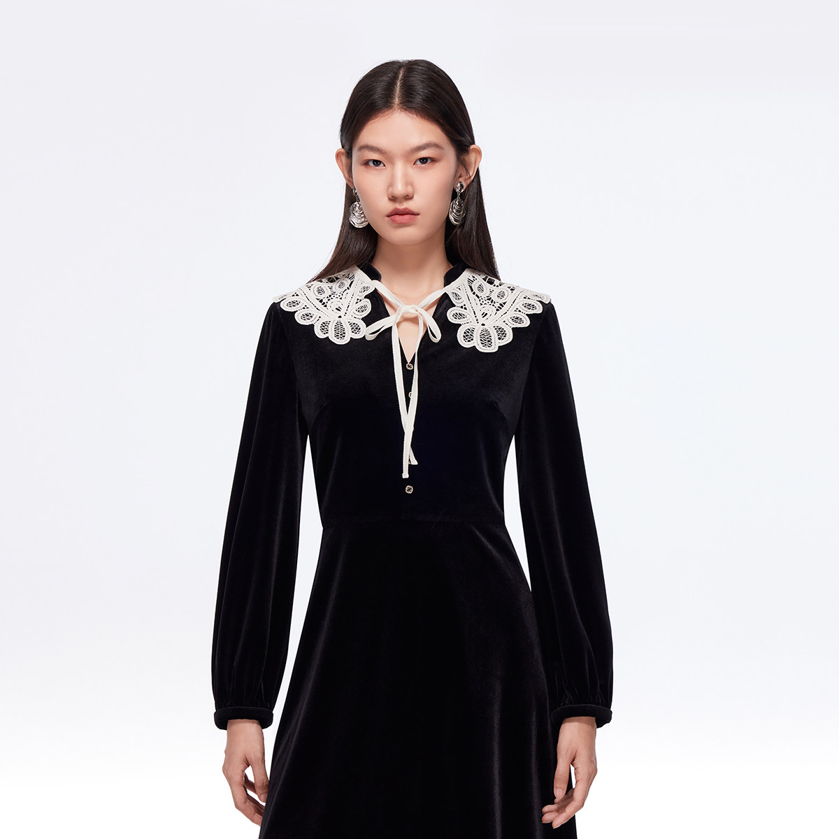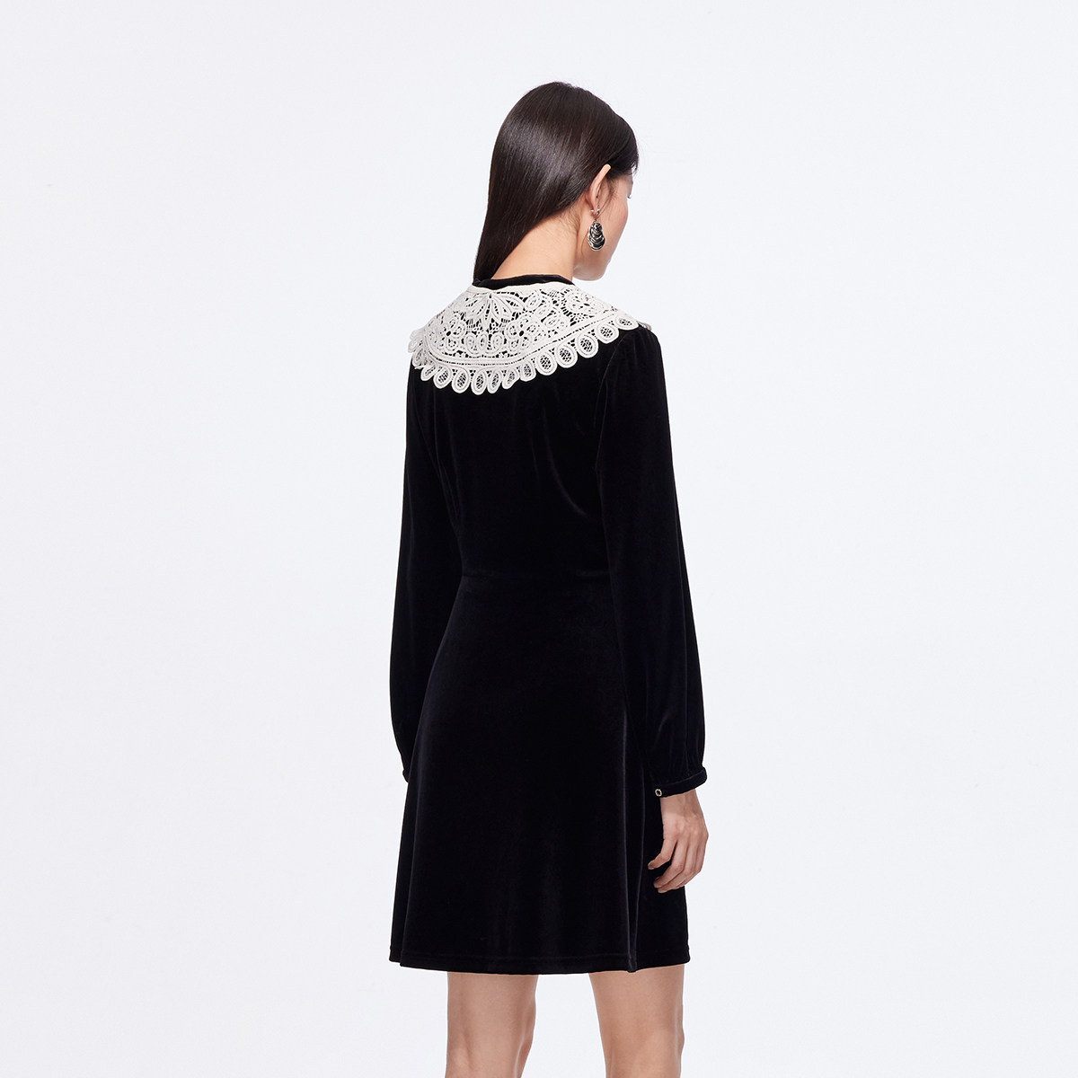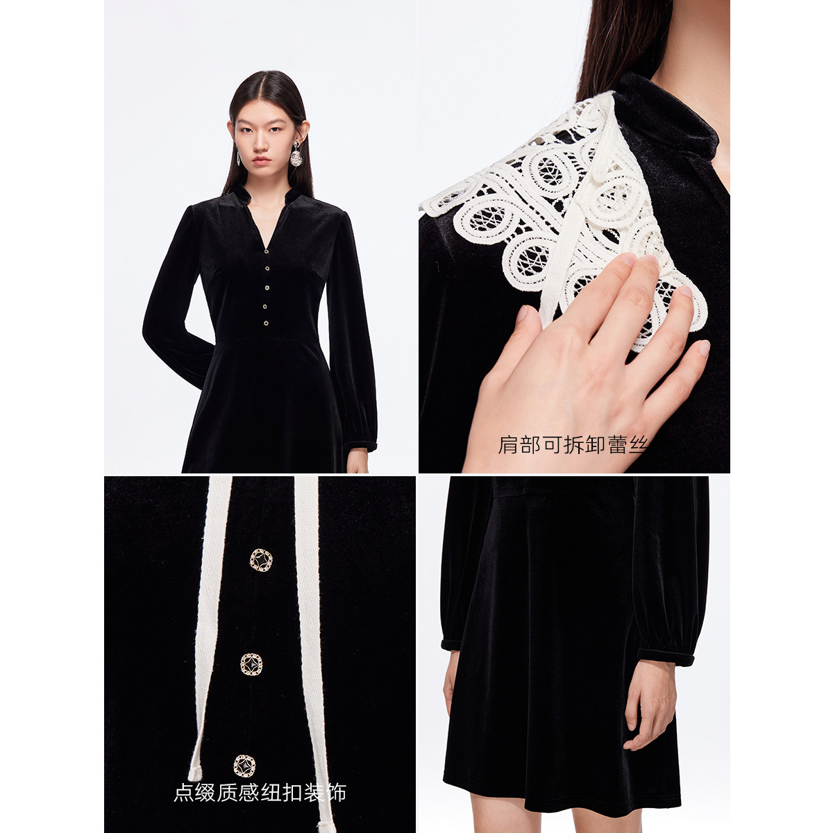 Vero Moda连衣裙女2025秋冬新款可拆蕾丝披肩高腰显瘦丝绒裙优雅