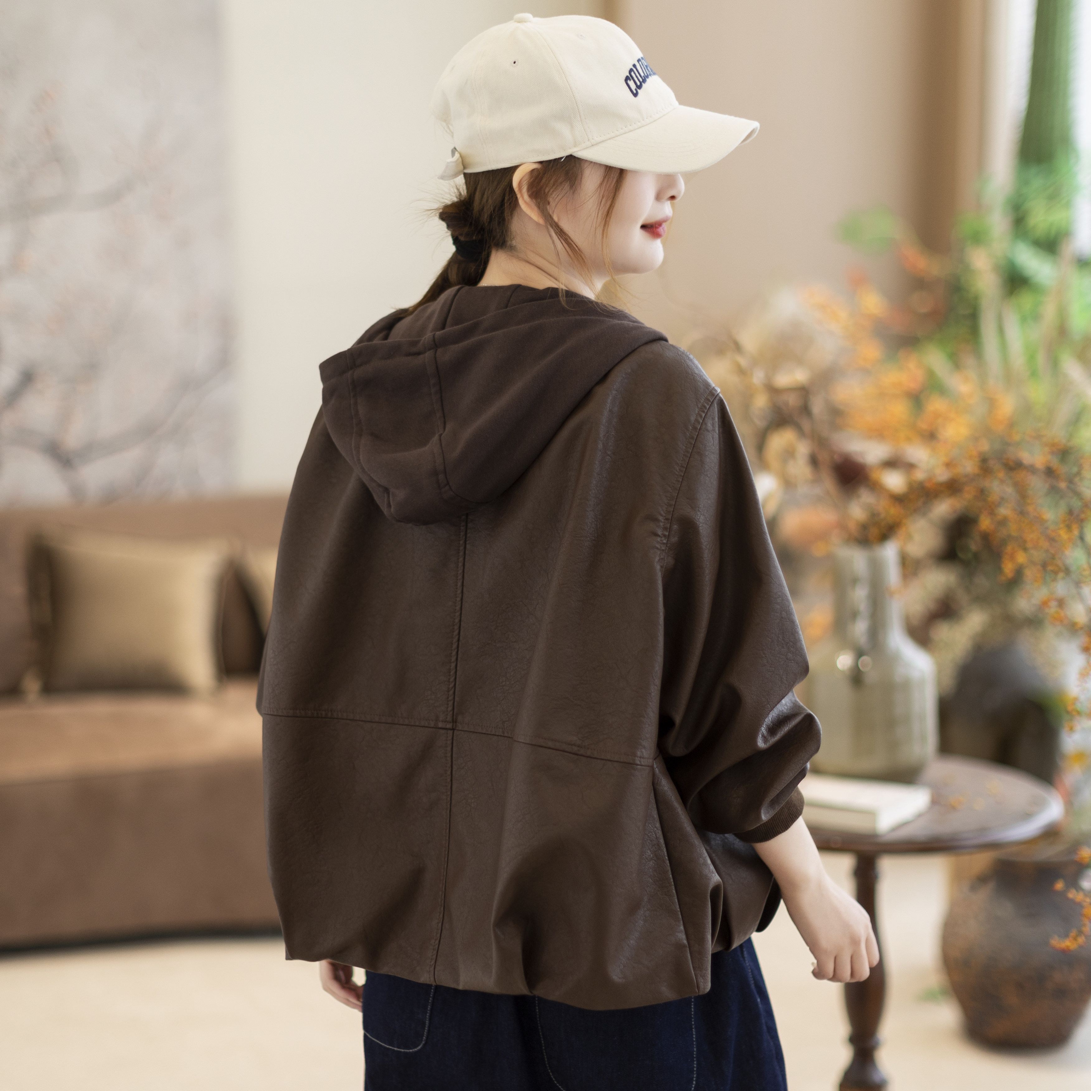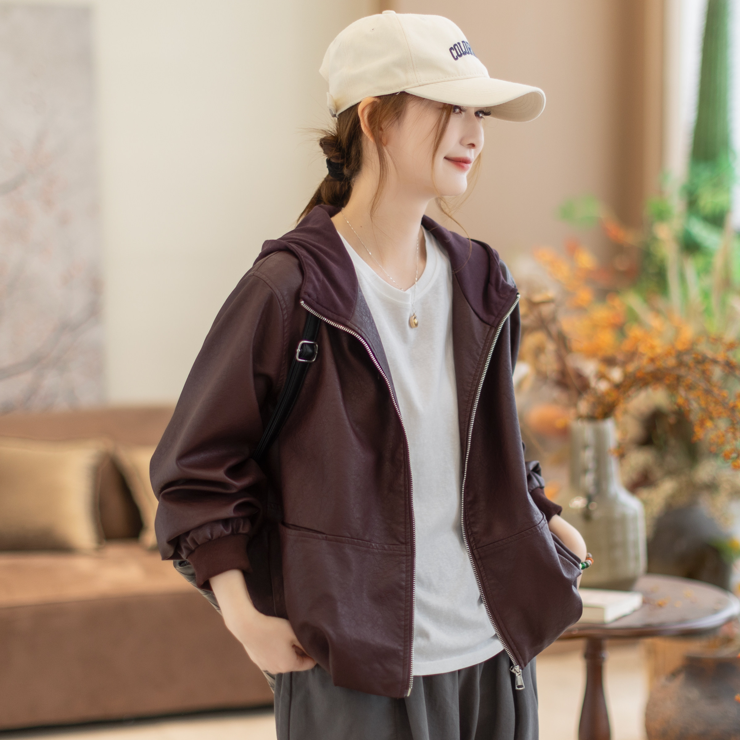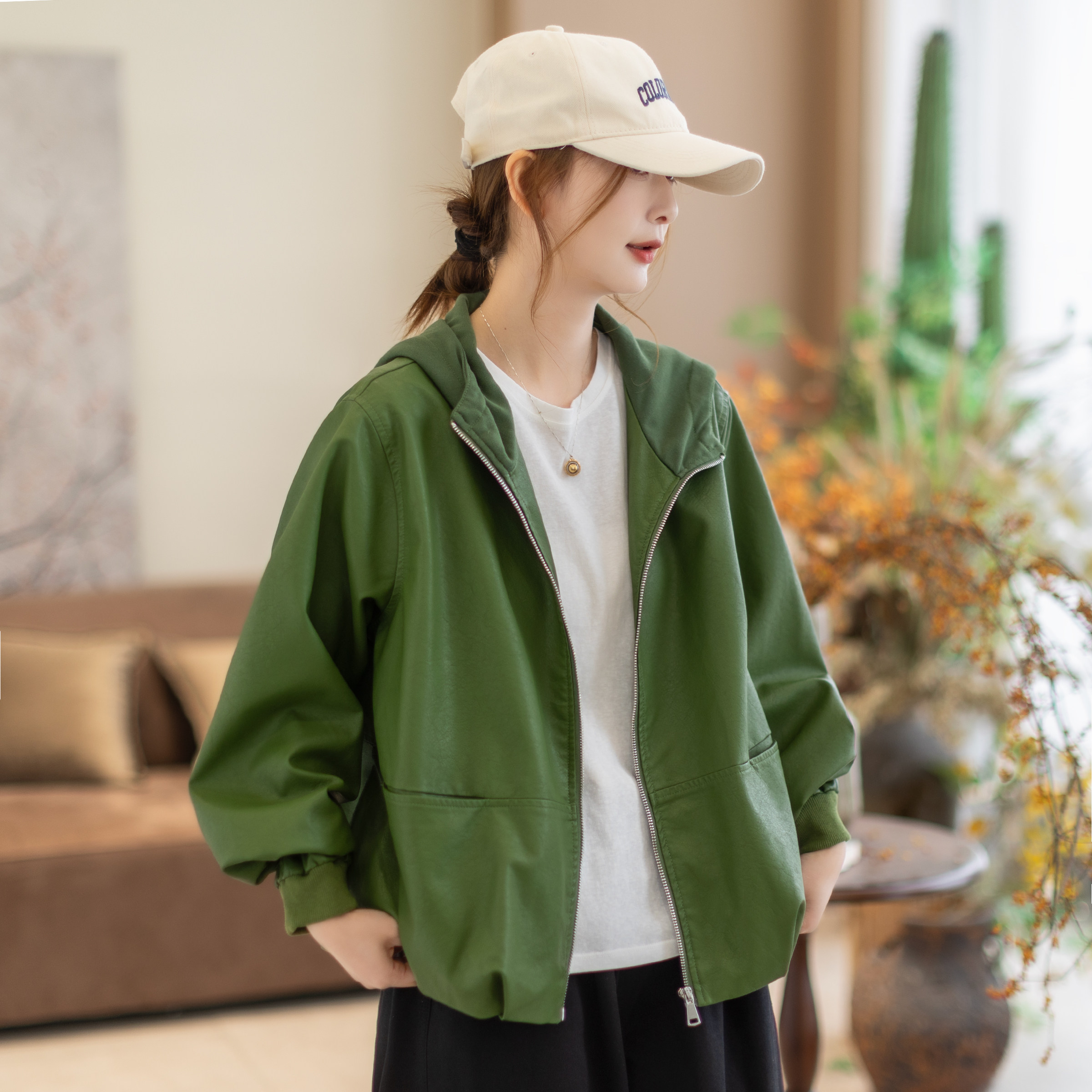 咖咪羽皮夹克女春秋新款女士连帽洋气纯色通勤气质女款上衣外套