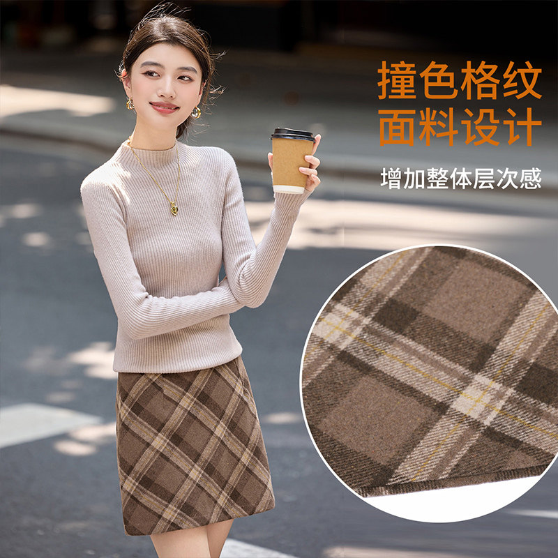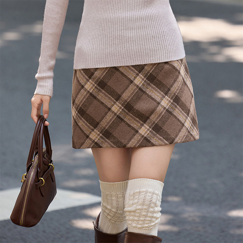 撞色格纹 含羊毛高腰短款A字裙防走光裤里