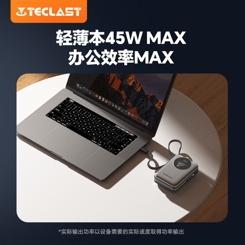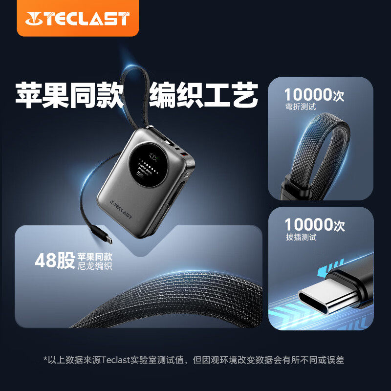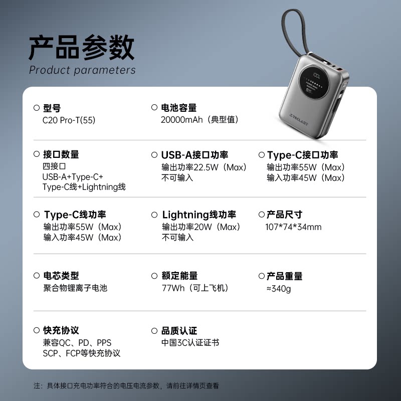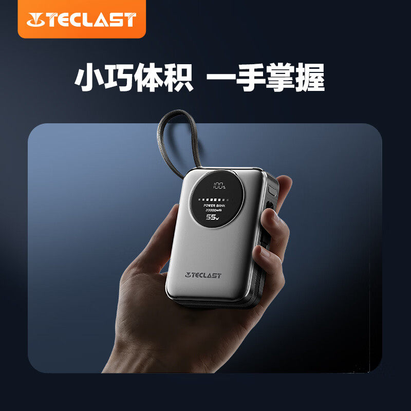 台电充电宝【3C认证】20000毫安时自带线55W疾速秒充小巧充电宝可上飞机适用于苹果小米华为电脑