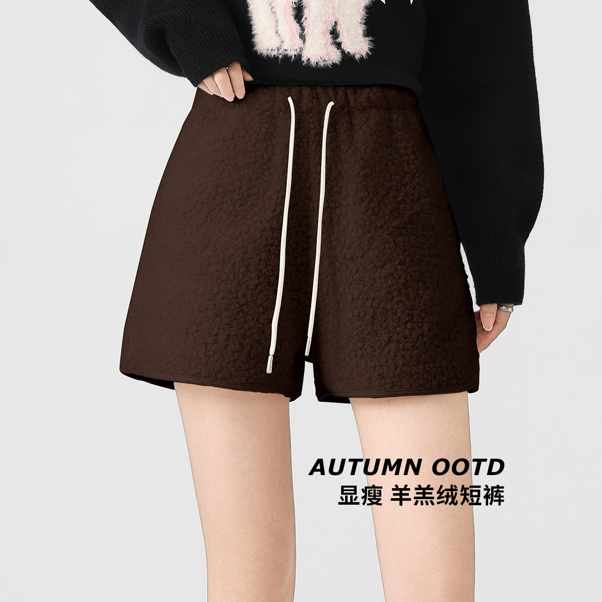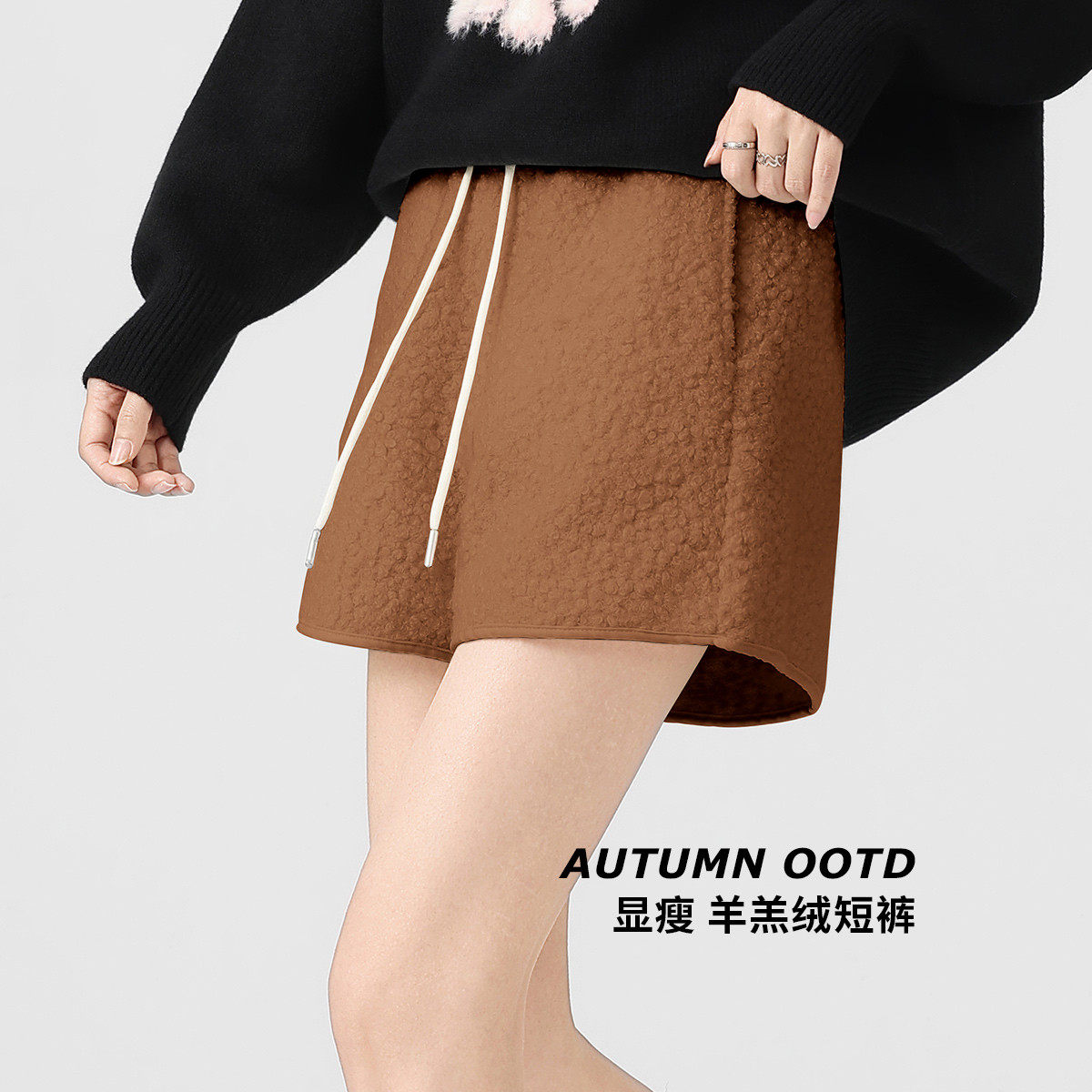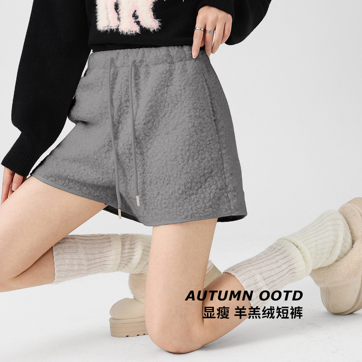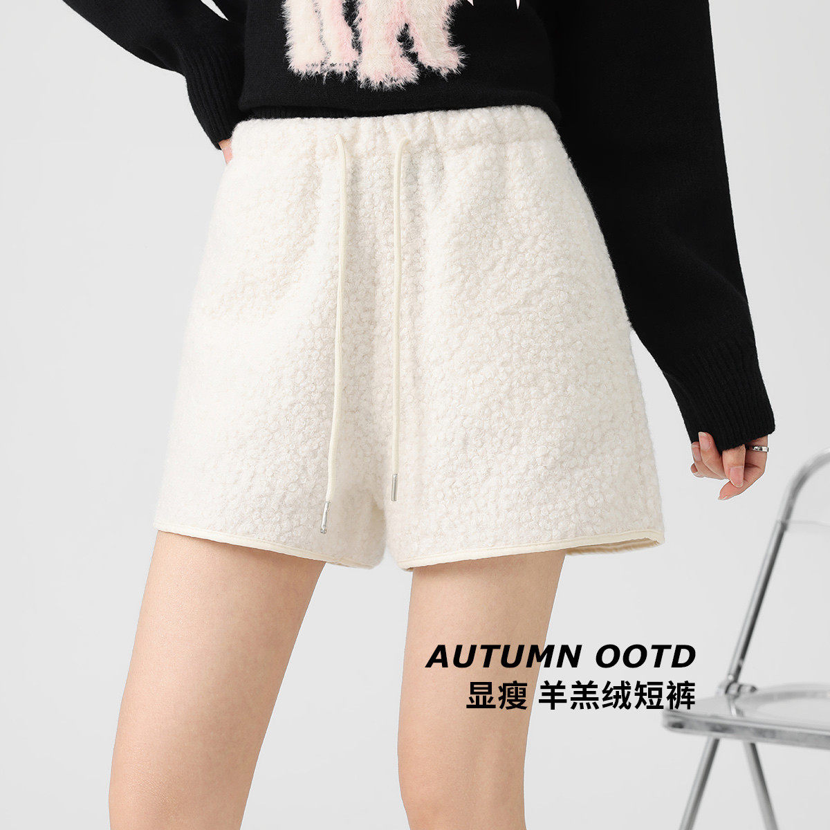 one more2025年冬季显瘦羊羔毛绒休闲短裤女高腰加绒A字型阔腿裤