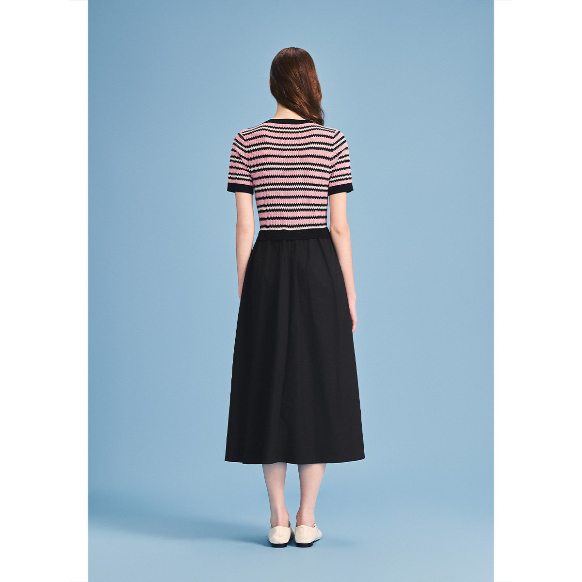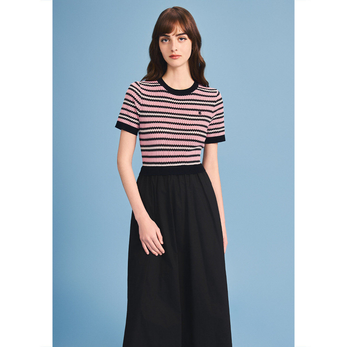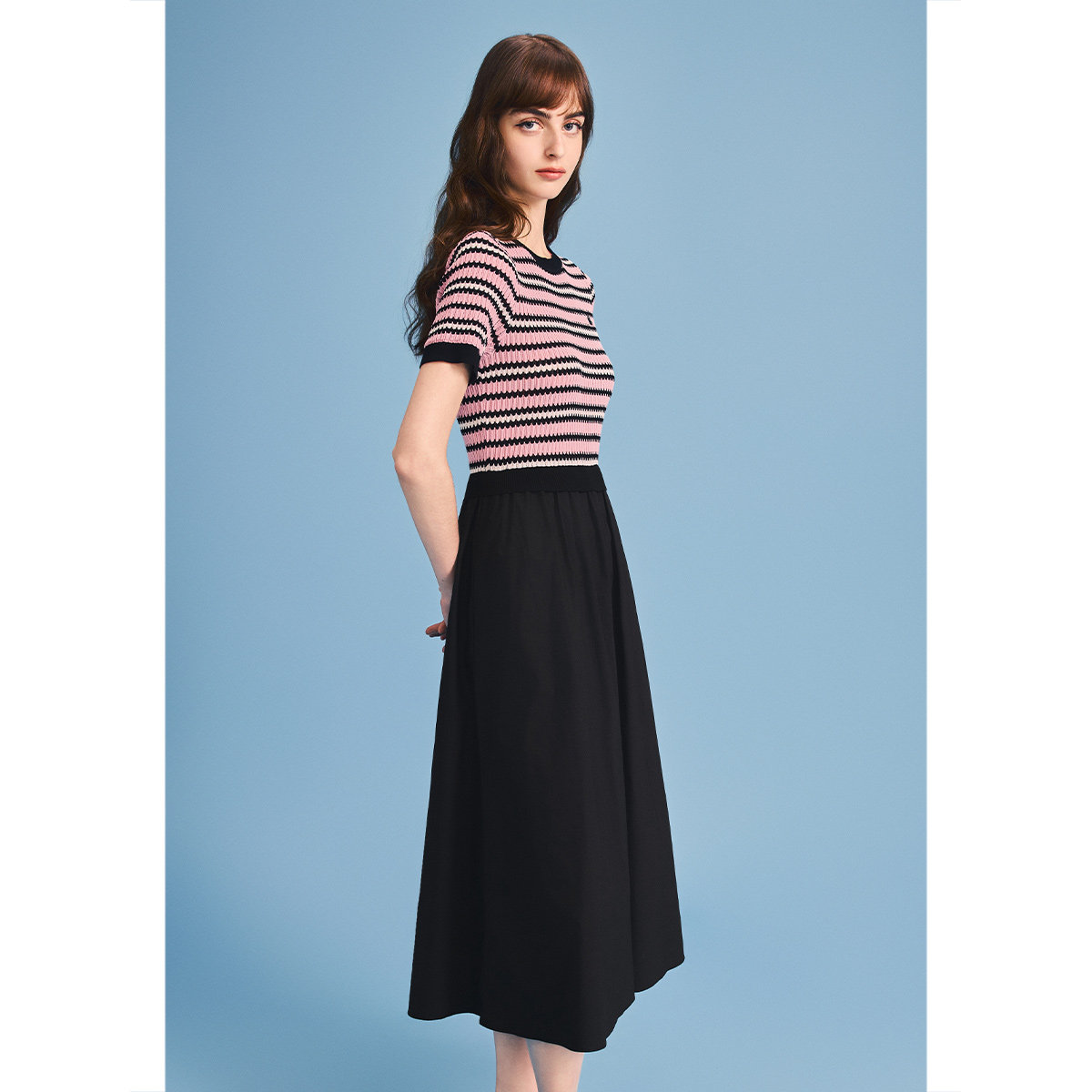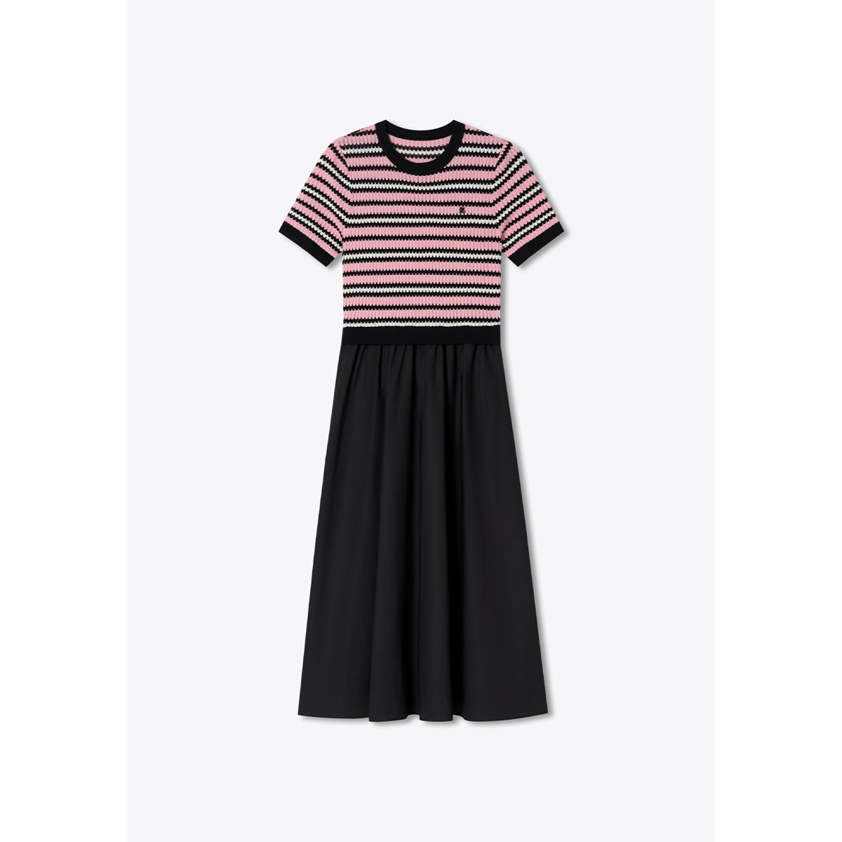 诗篇专选撞色罗纹针织短袖拼黑色伞摆连衣裙2026夏季新款