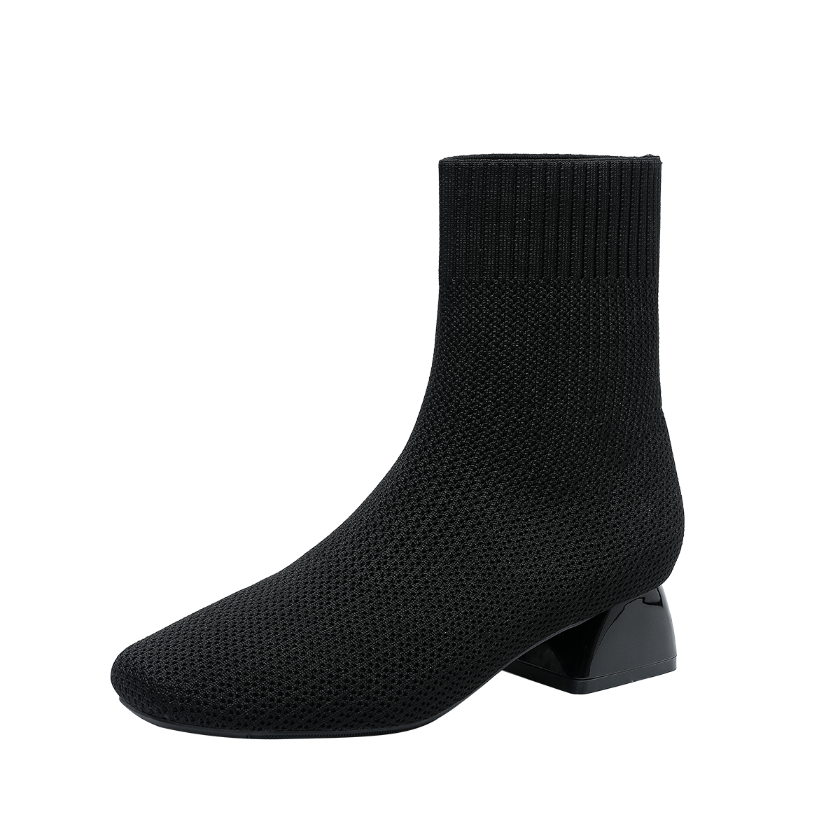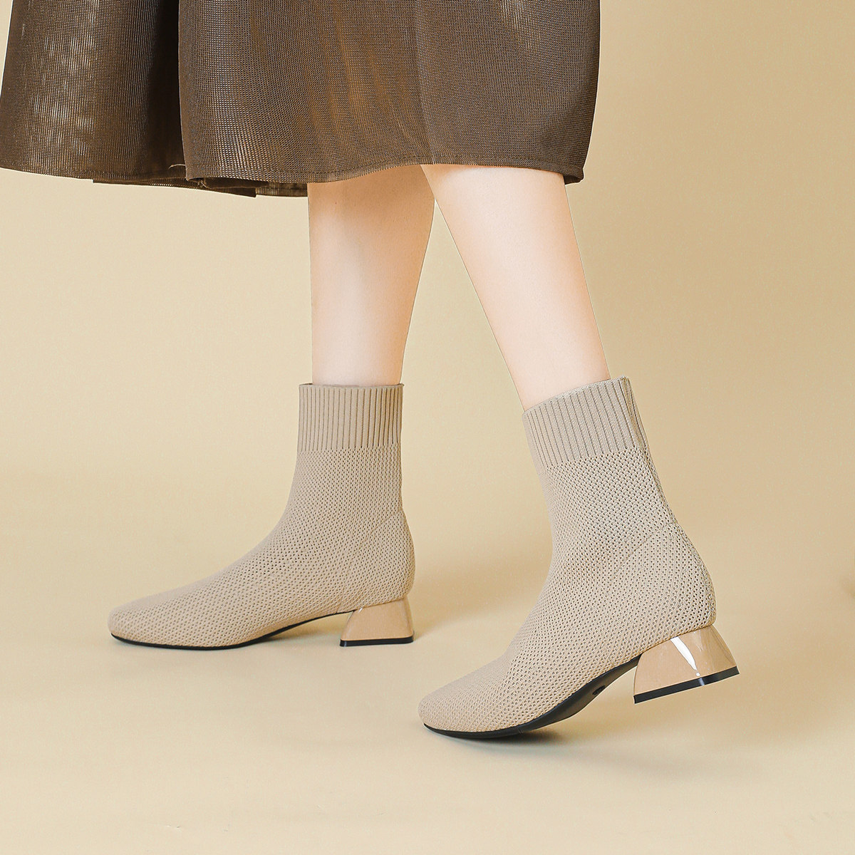 王妃鞋飞编针织鞋春秋冬款切尔西中高跟弹力布短靴子女士套脚女鞋