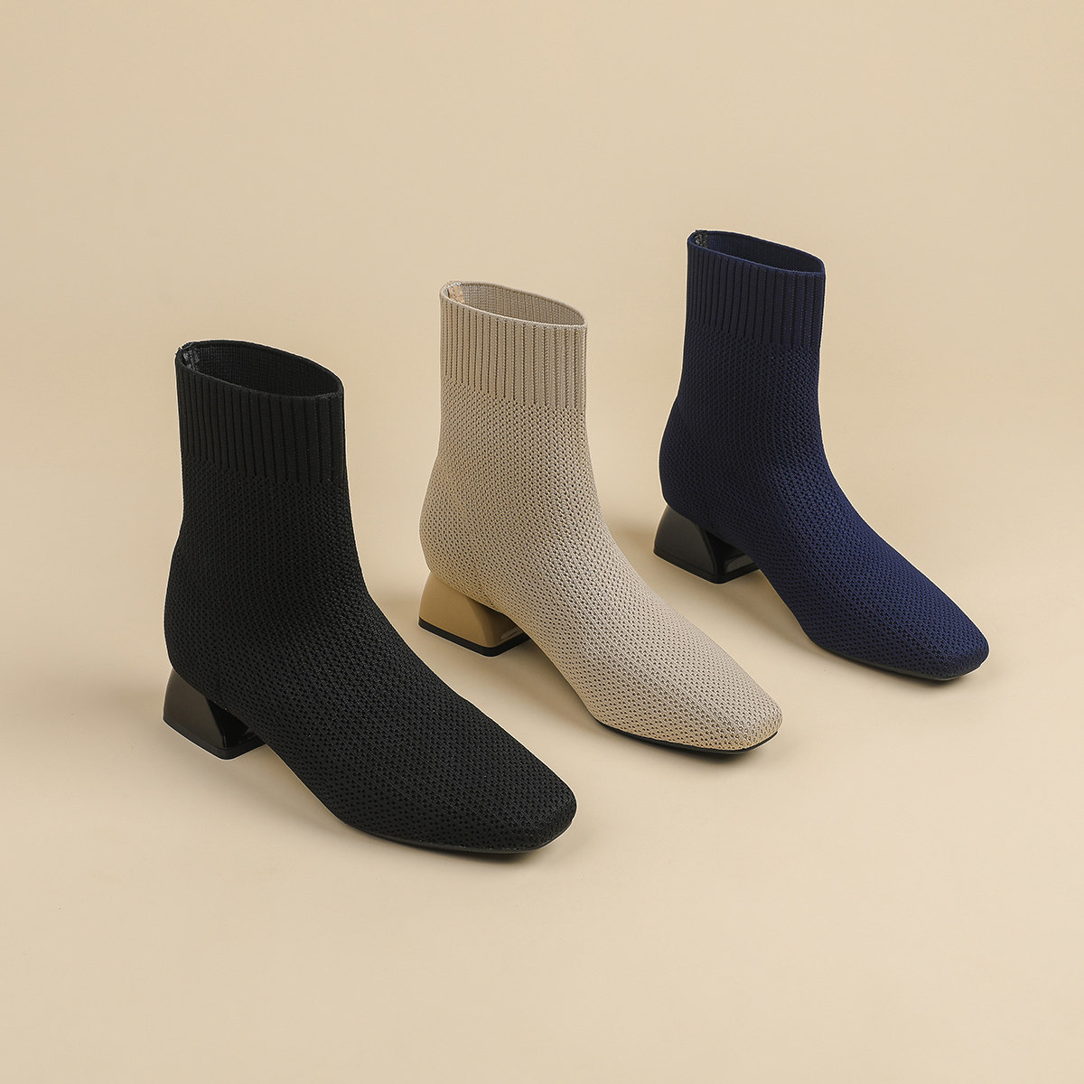 现韩国东大门2022ins简约气质小方头侧拉链小猫跟瘦瘦弹力短靴子