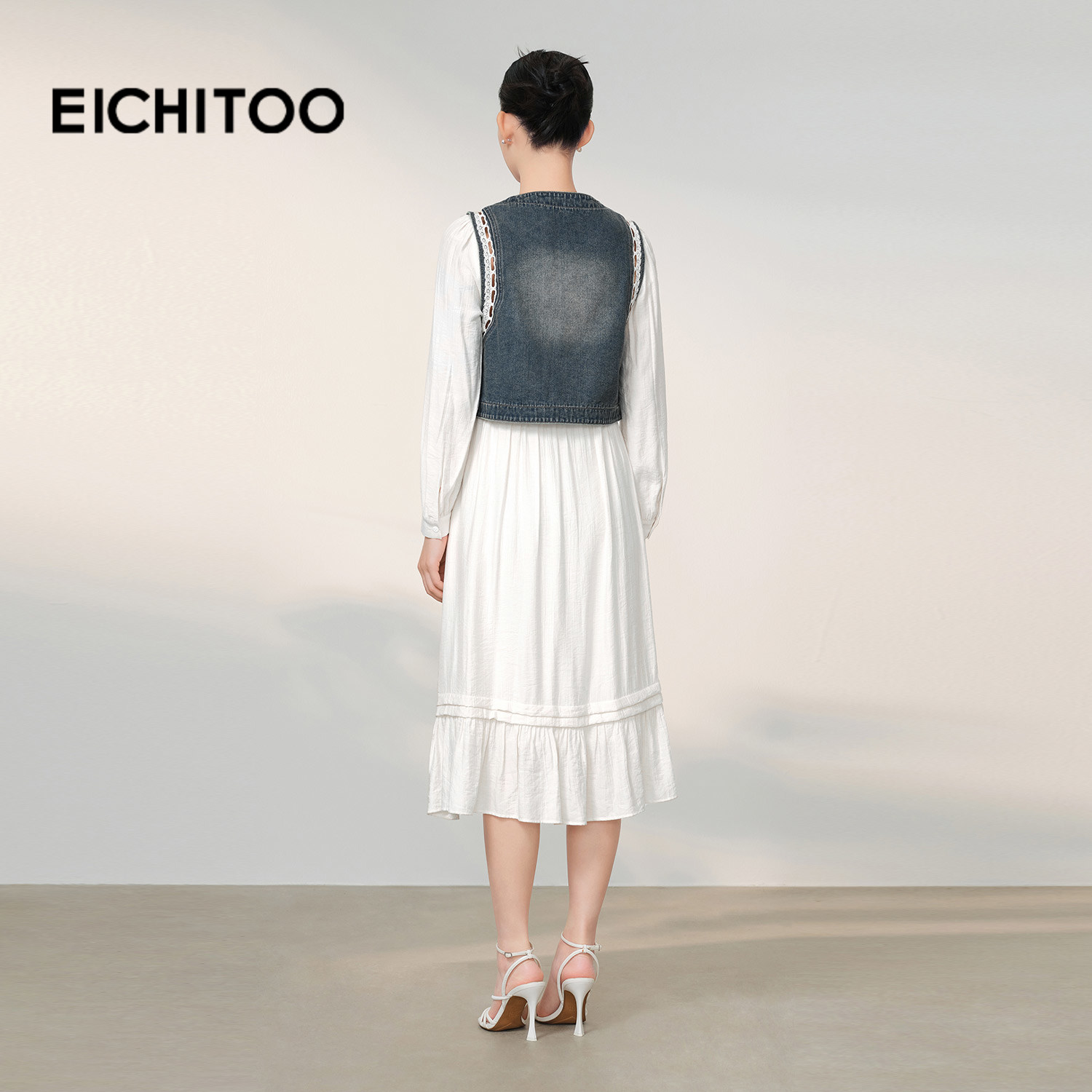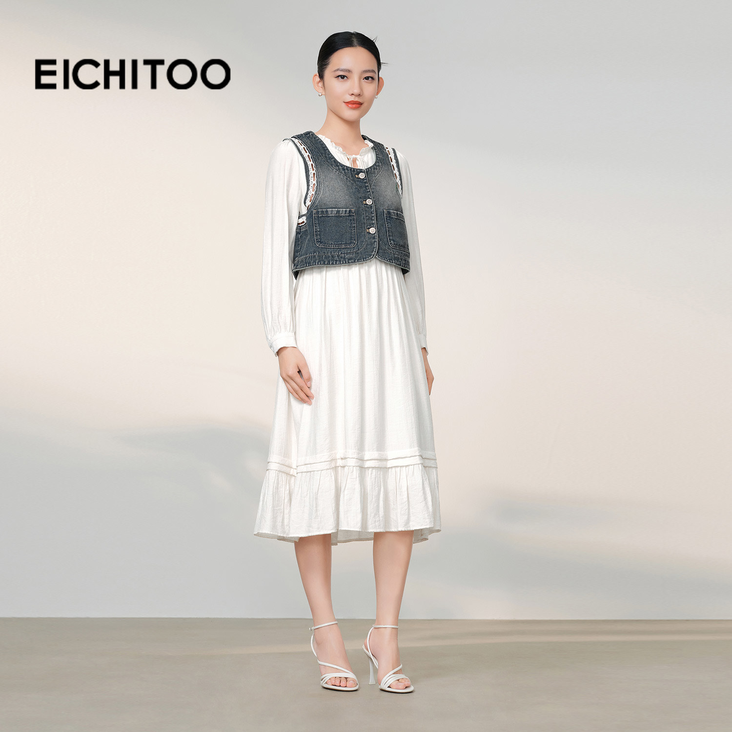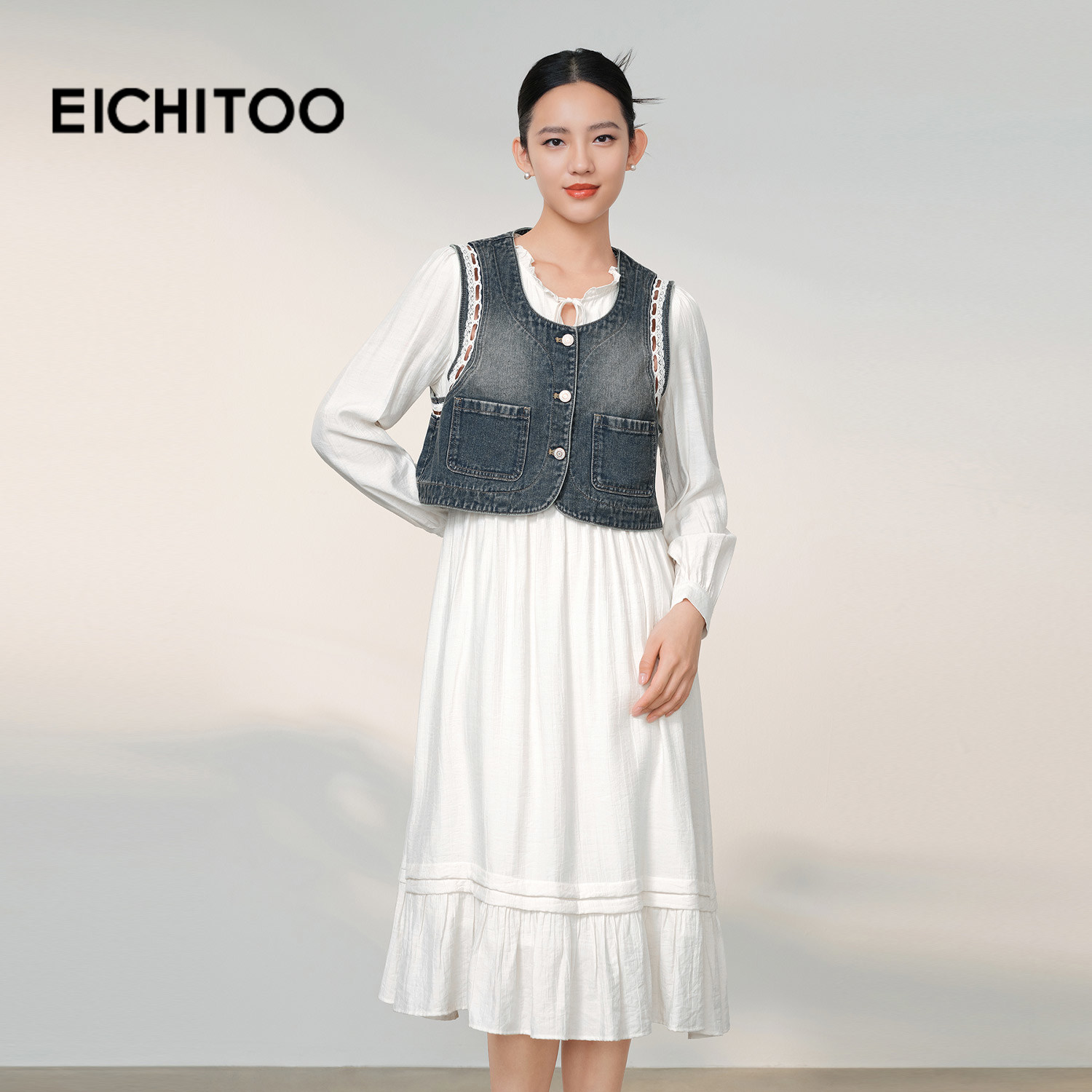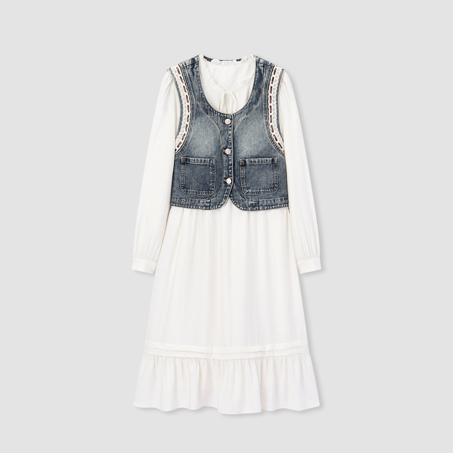 以木耳边白色长裙为基底,外搭水洗牛仔马甲