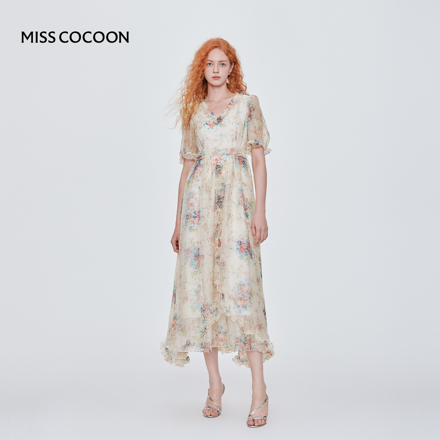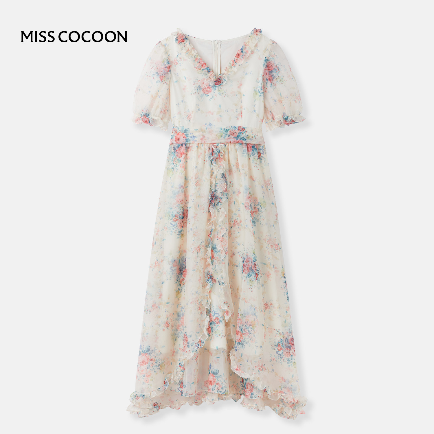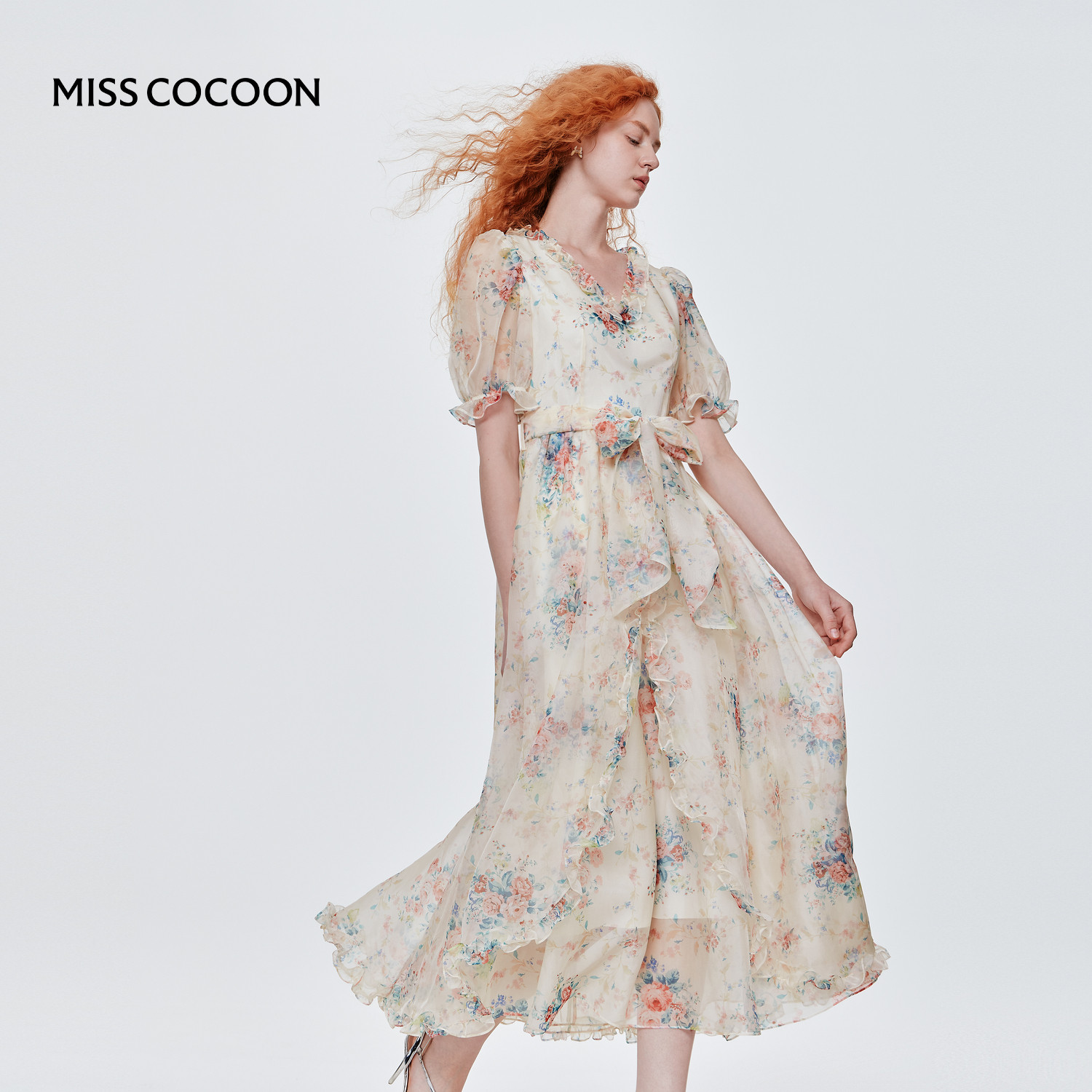 MISS COCOON可可尼碎花连衣裙女2025秋季新款欧根纱蝴蝶结V领裙子