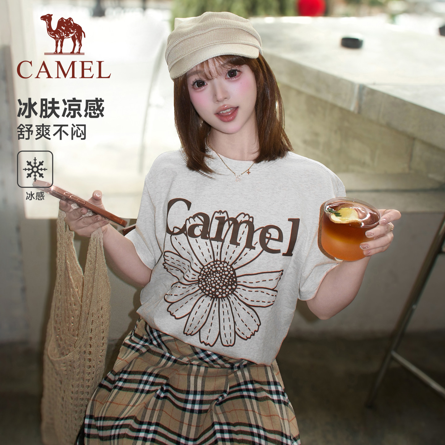 骆驼小雏菊冰皮T神短袖女26夏季棉感宽松休闲圆领韩系学生上衣T恤