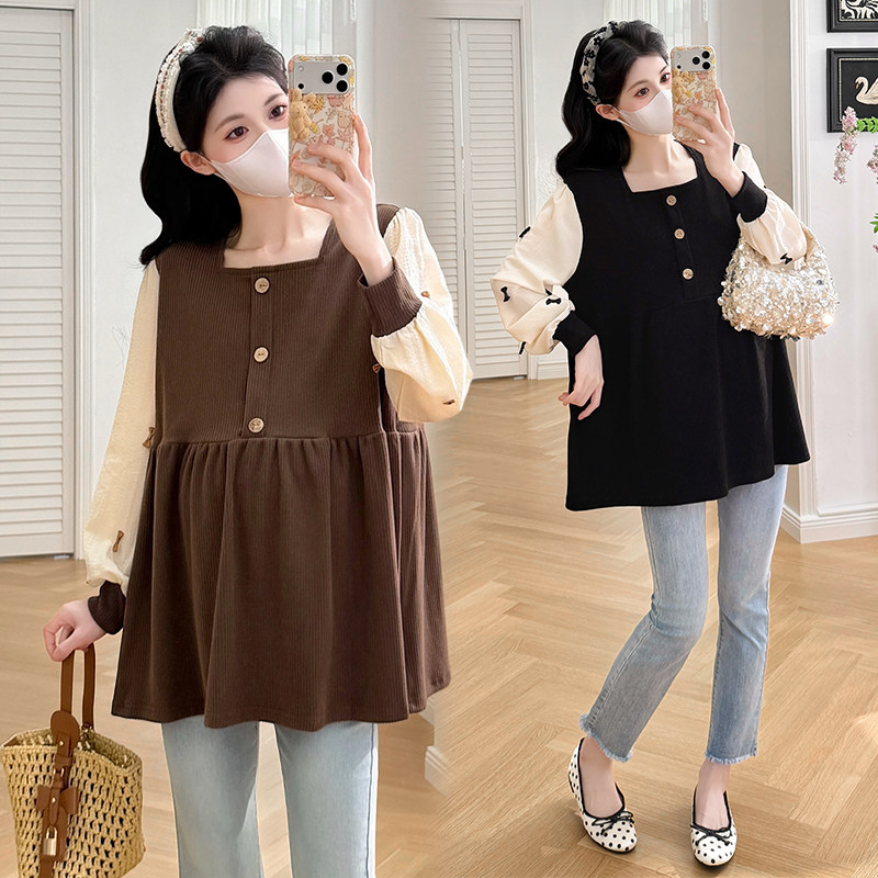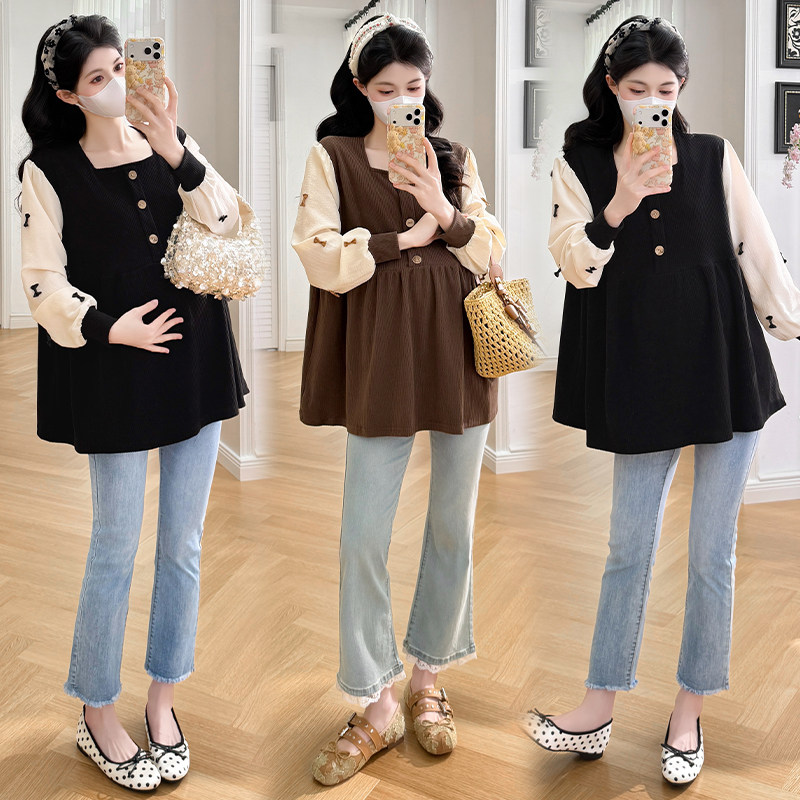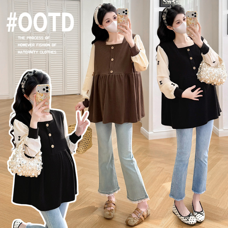 婧麒孕妇上衣2026春装新款长袖宽松甜美洋气遮孕肚方领孕妈上衣