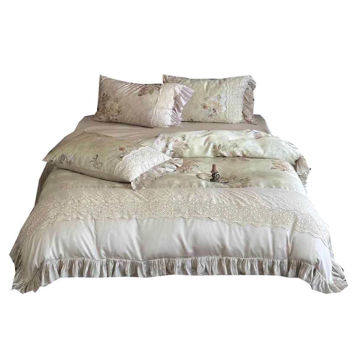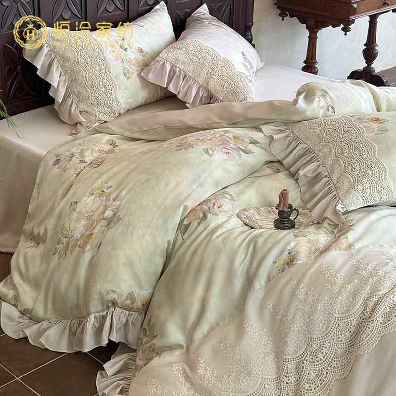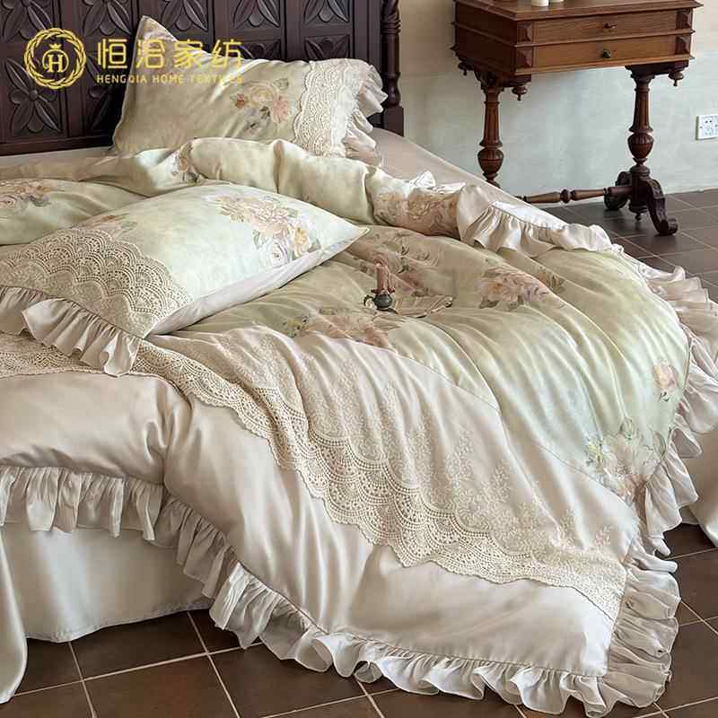 法式油画风凉感莱赛尔四件套花卉印花夏季裸睡蕾丝边被套床品绿色