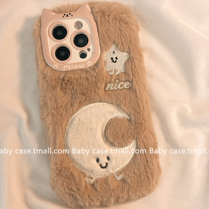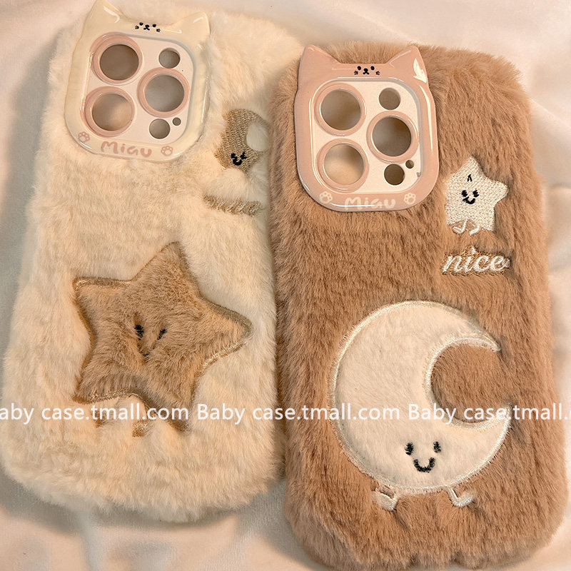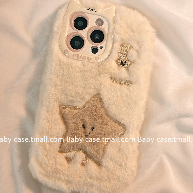 日韩简约毛绒星星月亮适用苹果17promax手机壳iPhone15新款16可爱卡通13少女14pm创意16promax网红14全包个性