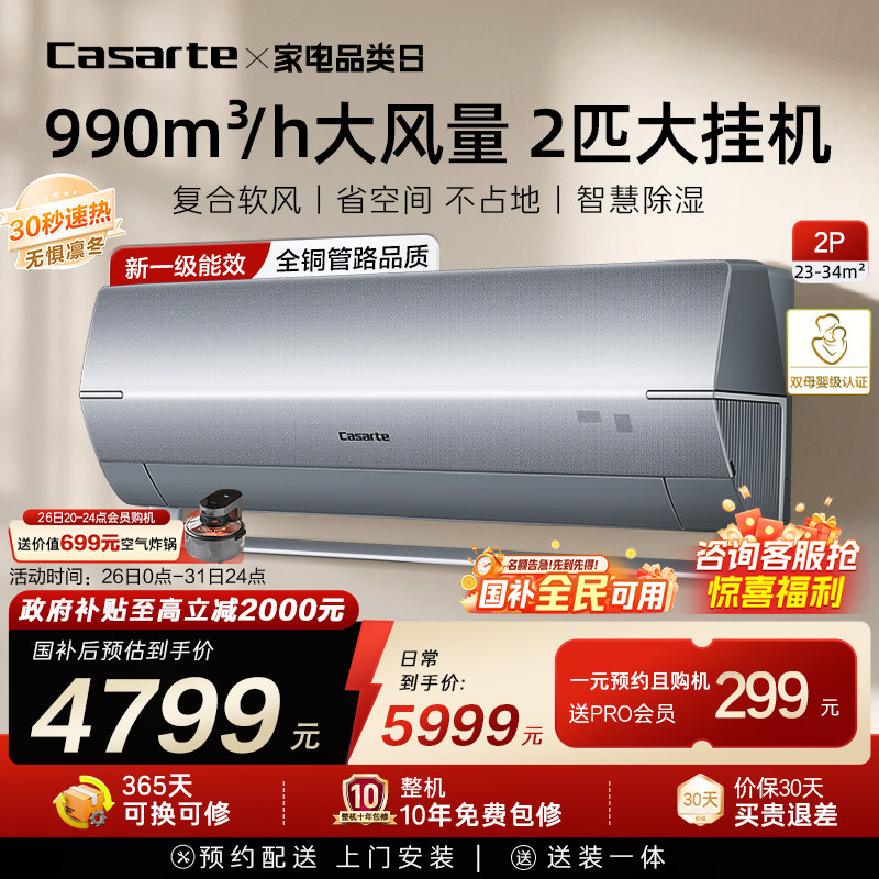 换新补贴卡萨帝空调挂机变频家用卧室除湿冷暖省空间风量新1级2匹
