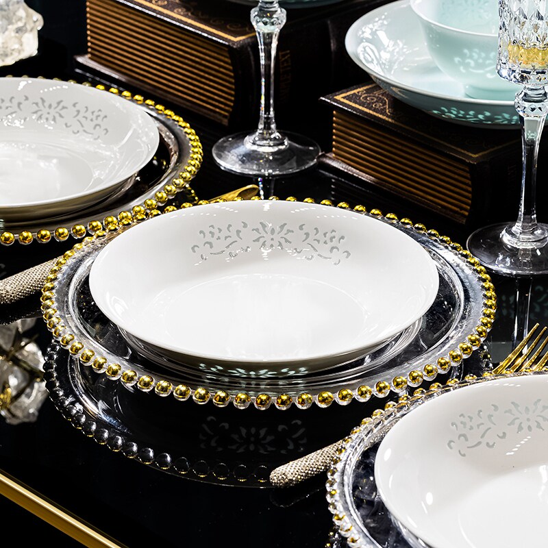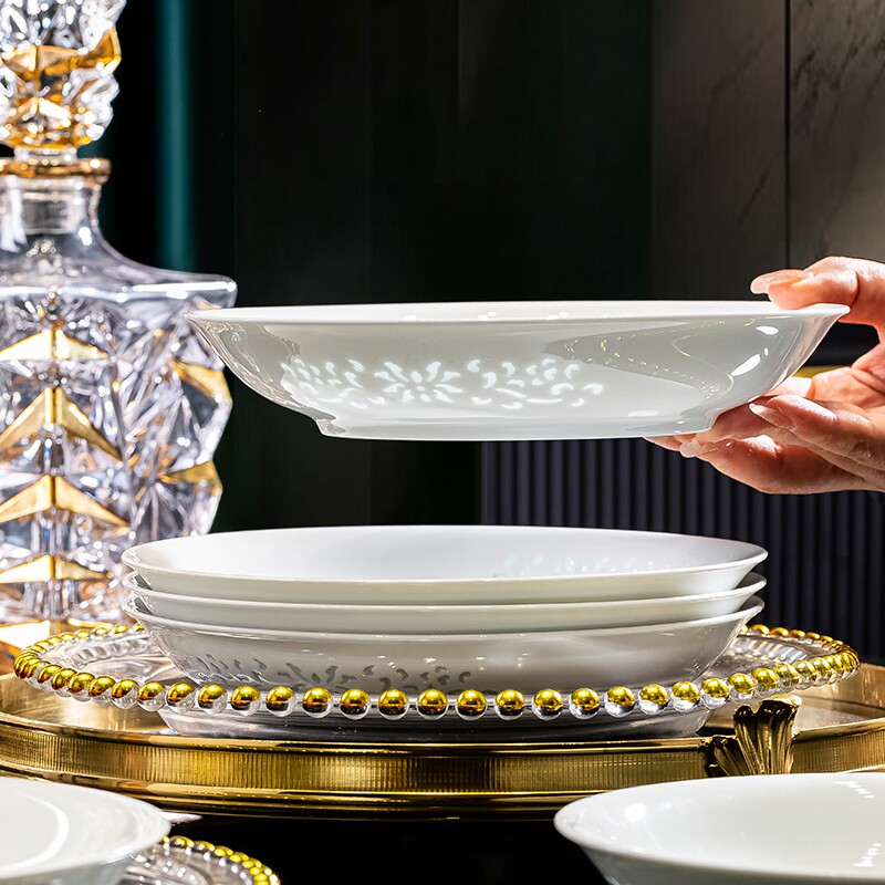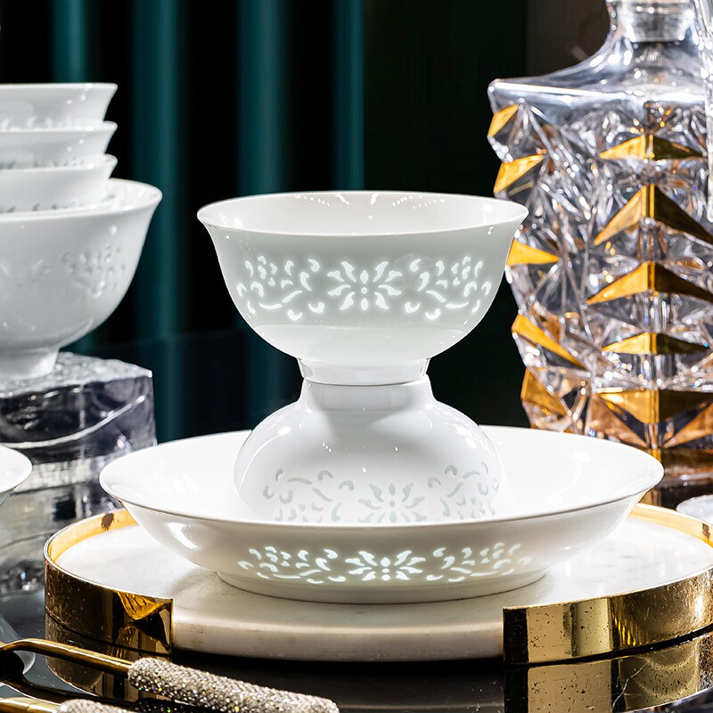 景德镇玲珑瓷高白瓷餐具碗盘组合家用釉下彩碗饭碗面碗泡面碗深盘