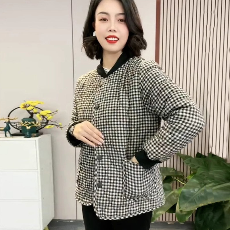 中老年秋冬新款时尚格子加绒短外套妈妈装洋气圆领加厚保暖棉服女