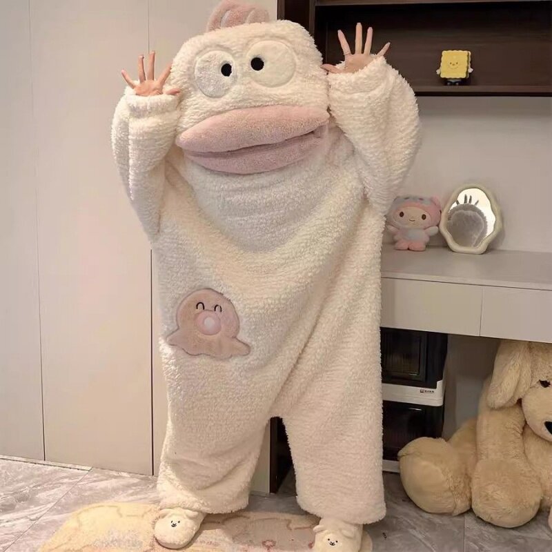 丑鱼连体睡衣女珊瑚绒加厚保暖睡袋冬季大嘴鱼睡袍男亲子可爱白色