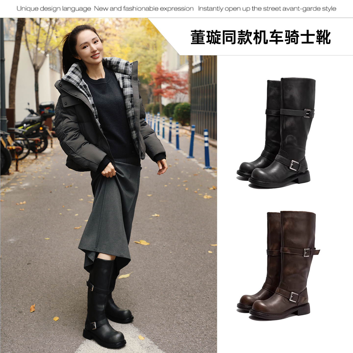潼潼TONG毒液靴皮带扣高筒骑士靴2025新款真皮复古粗跟厚底机车靴