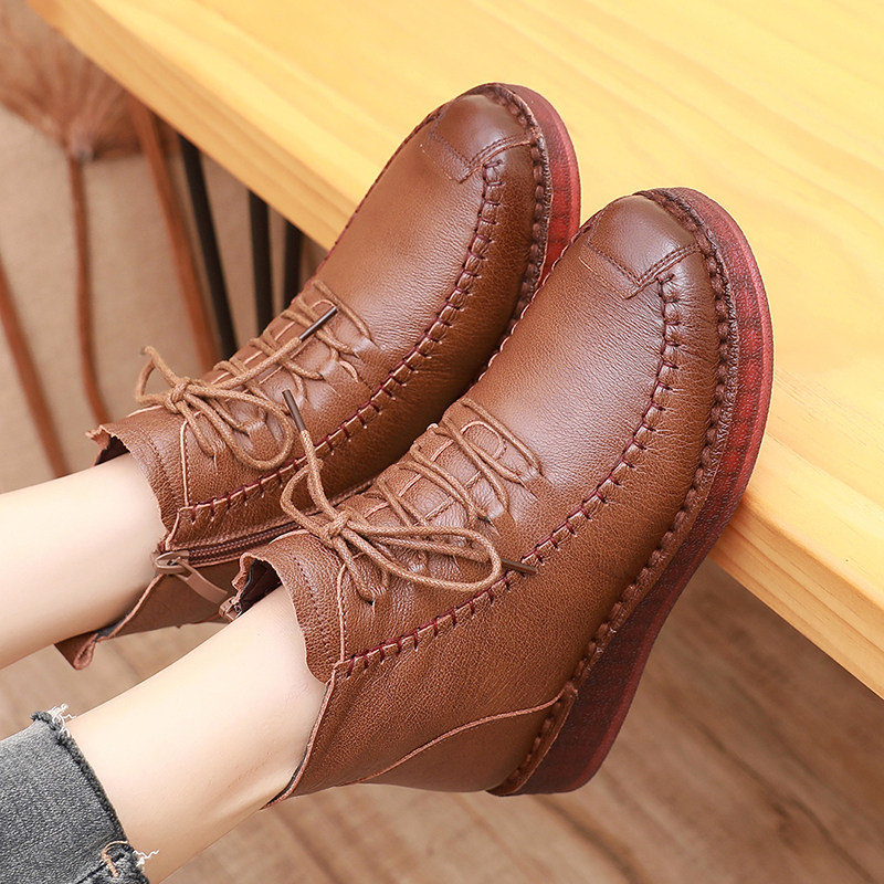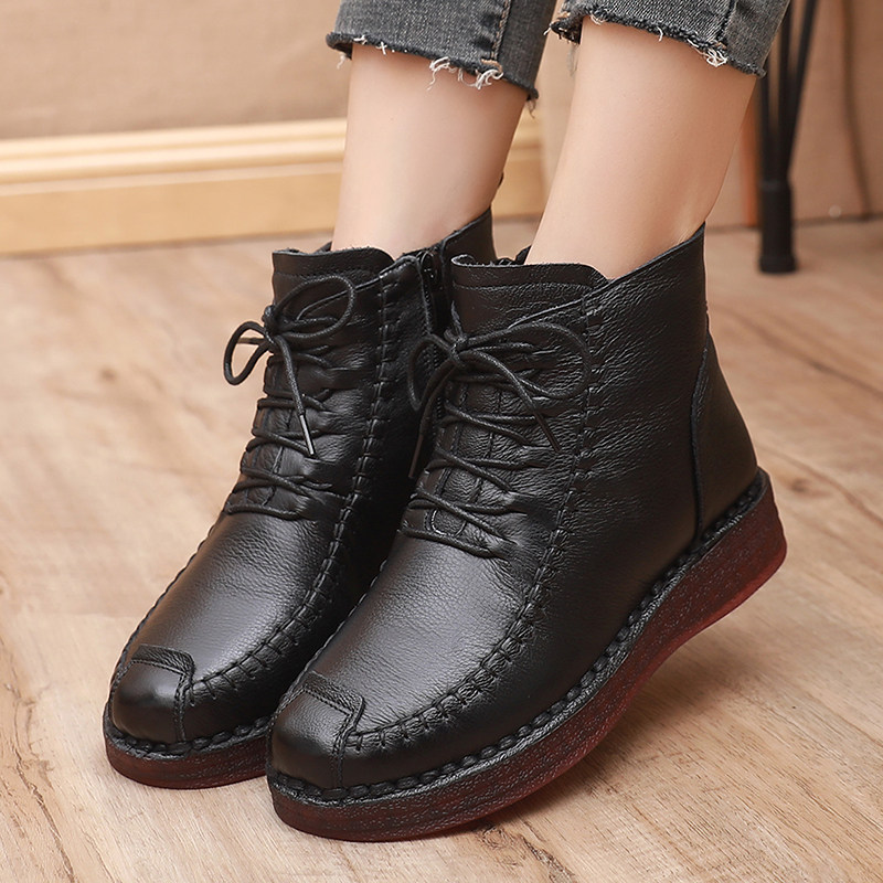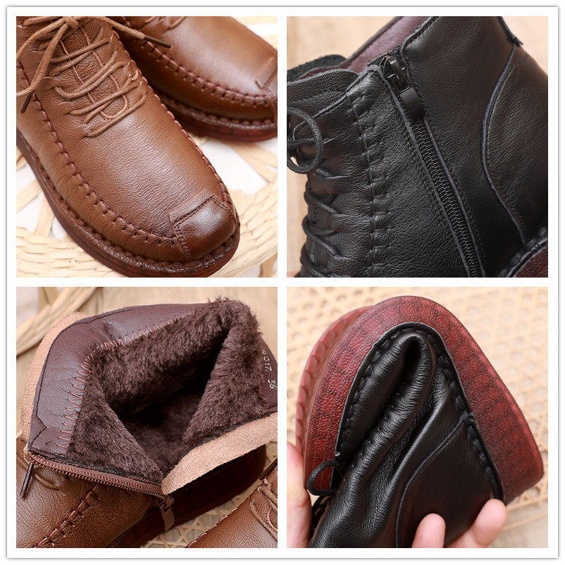 他她女孩牛筋底马丁靴女冬季新款真皮妈妈棉鞋女平底短靴加绒圆头