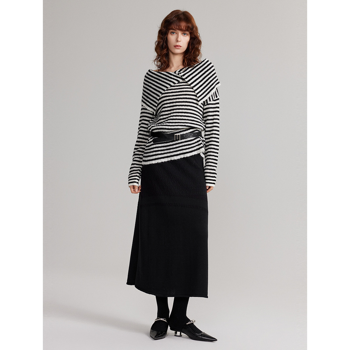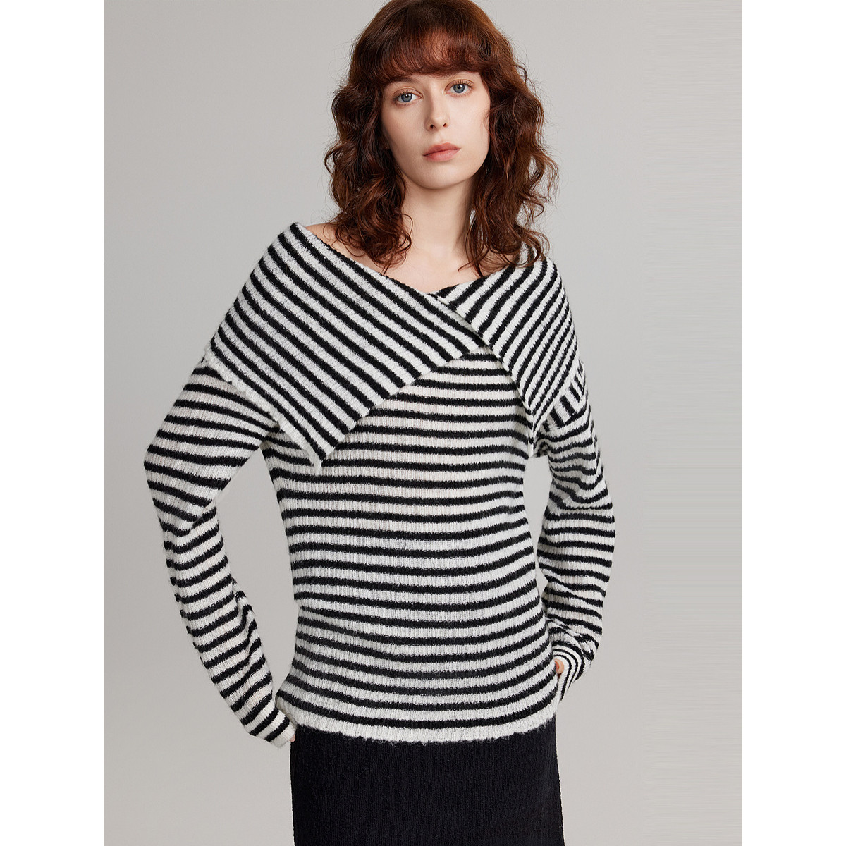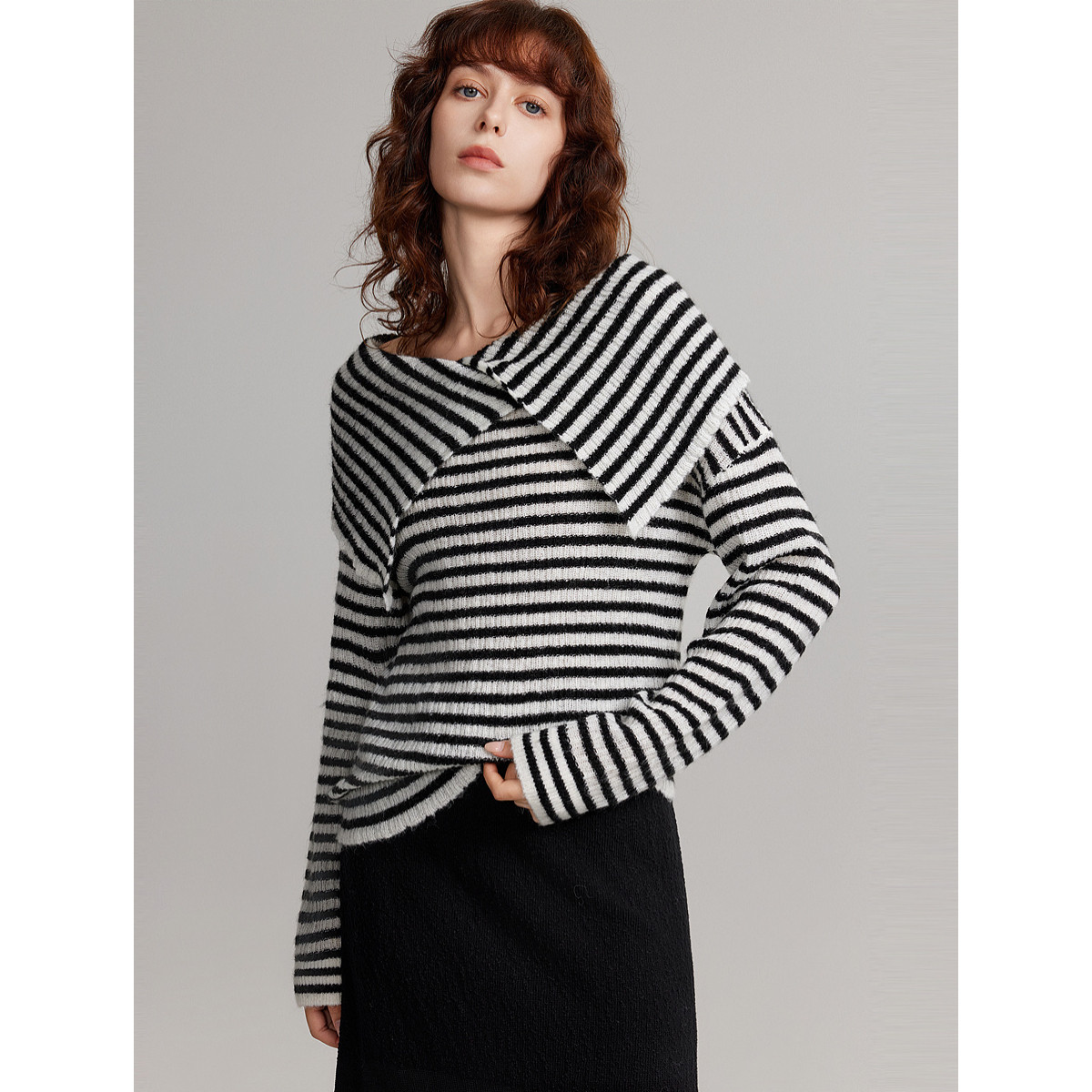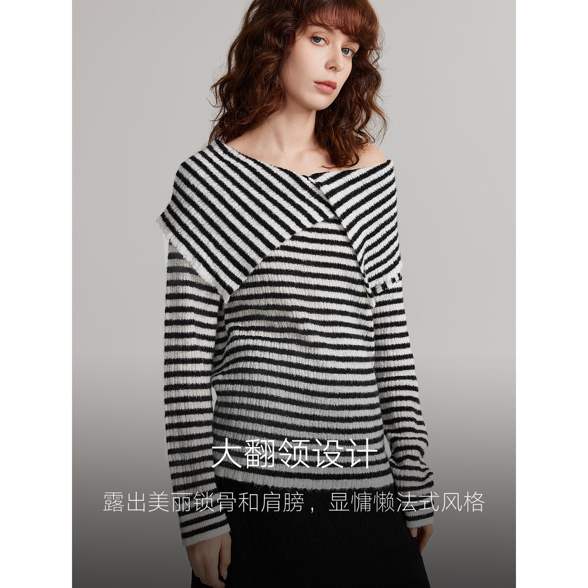 ELLE黑白条纹一字肩大翻领毛衣女2025秋季新款马海毛时髦气质上衣
