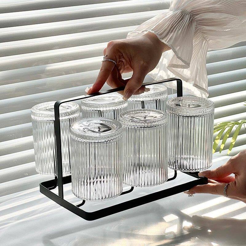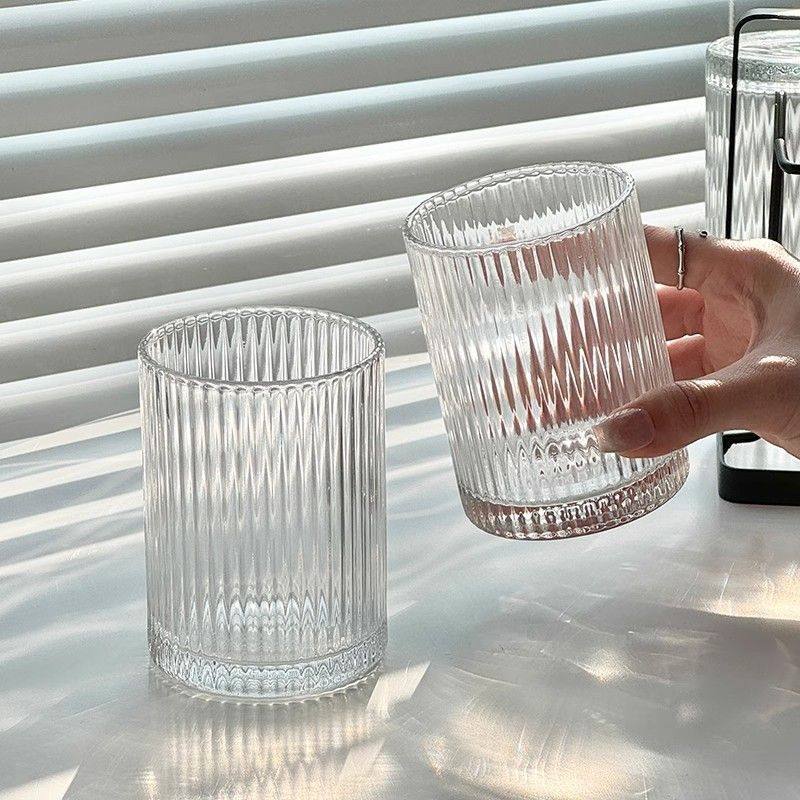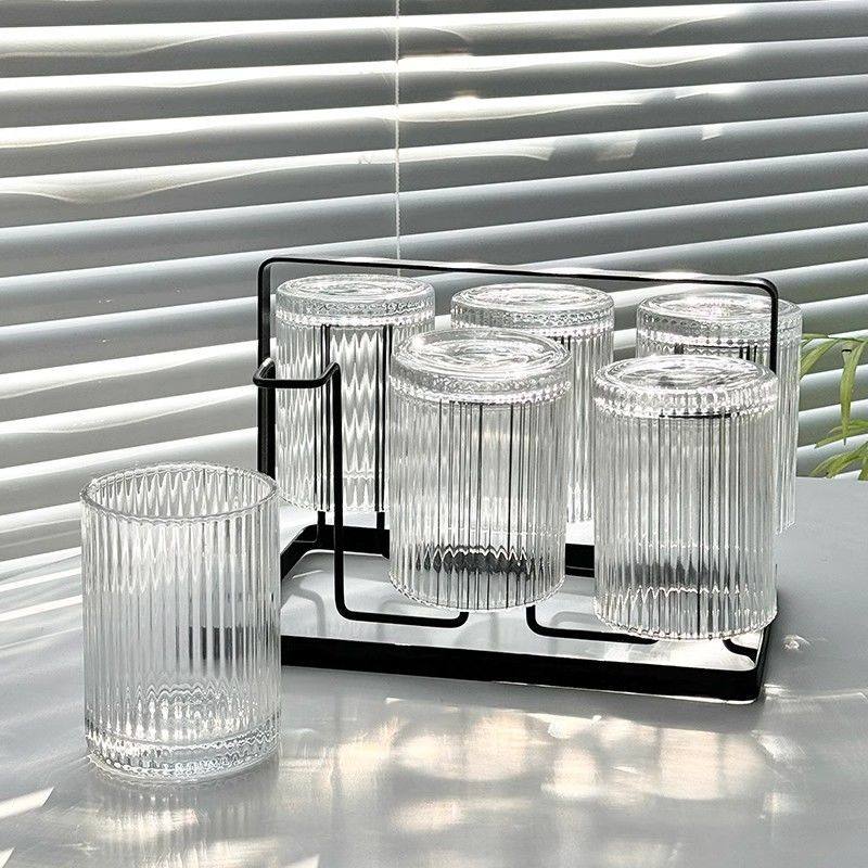 ins简约竖纹玻璃杯冰美式咖啡杯牛奶吸管杯杯架套装家用待客便携