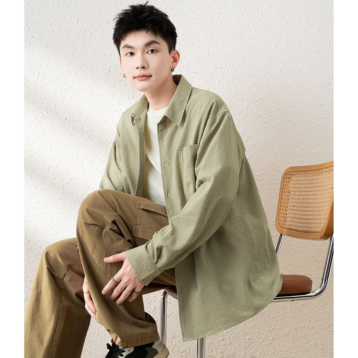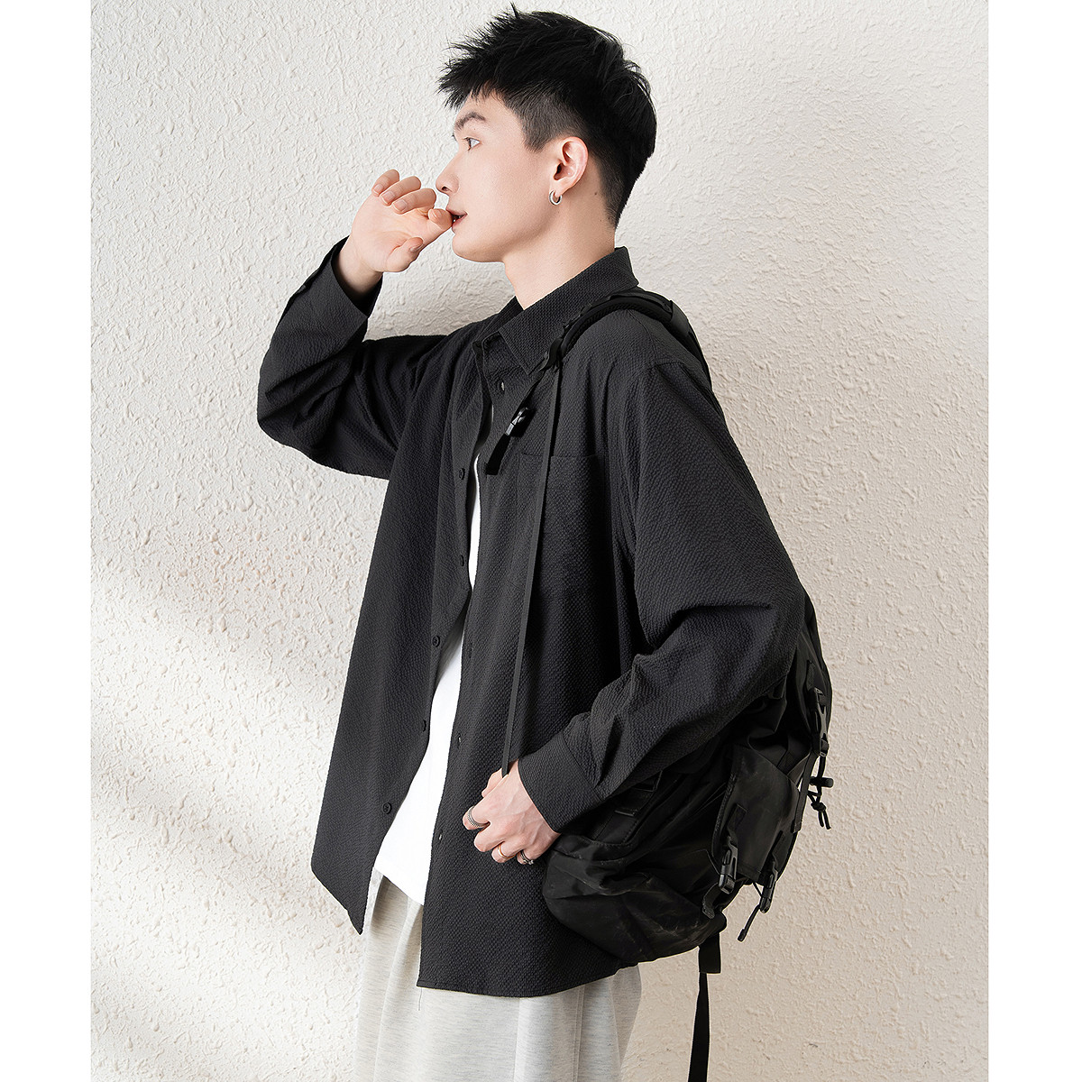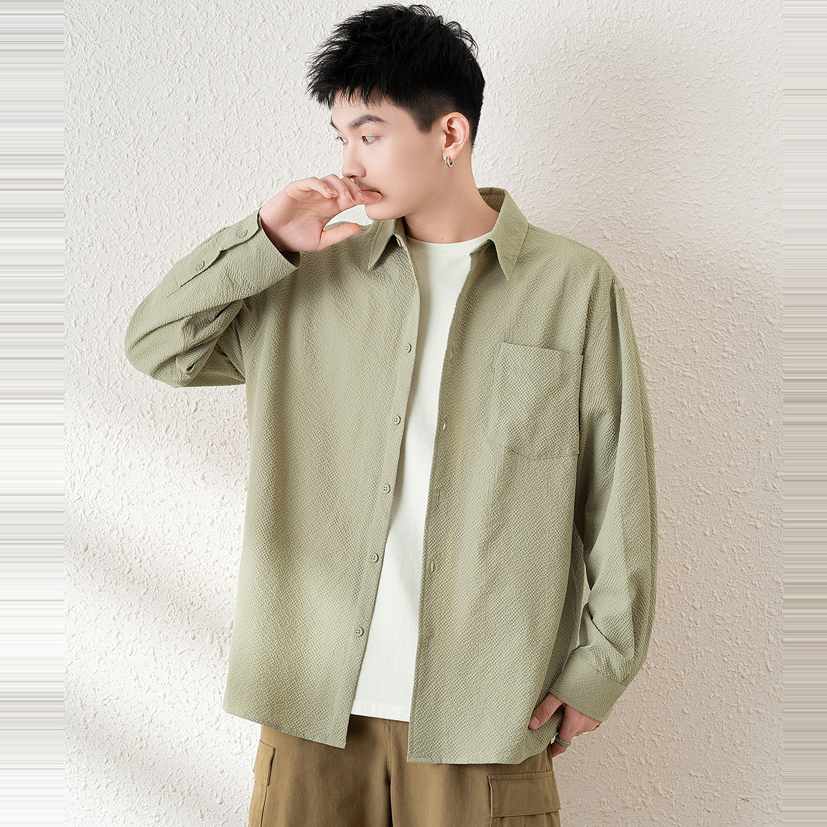 唐狮春新款长袖衬衫男日系港风宽松衬衣青少年纯色衬衫外套TM