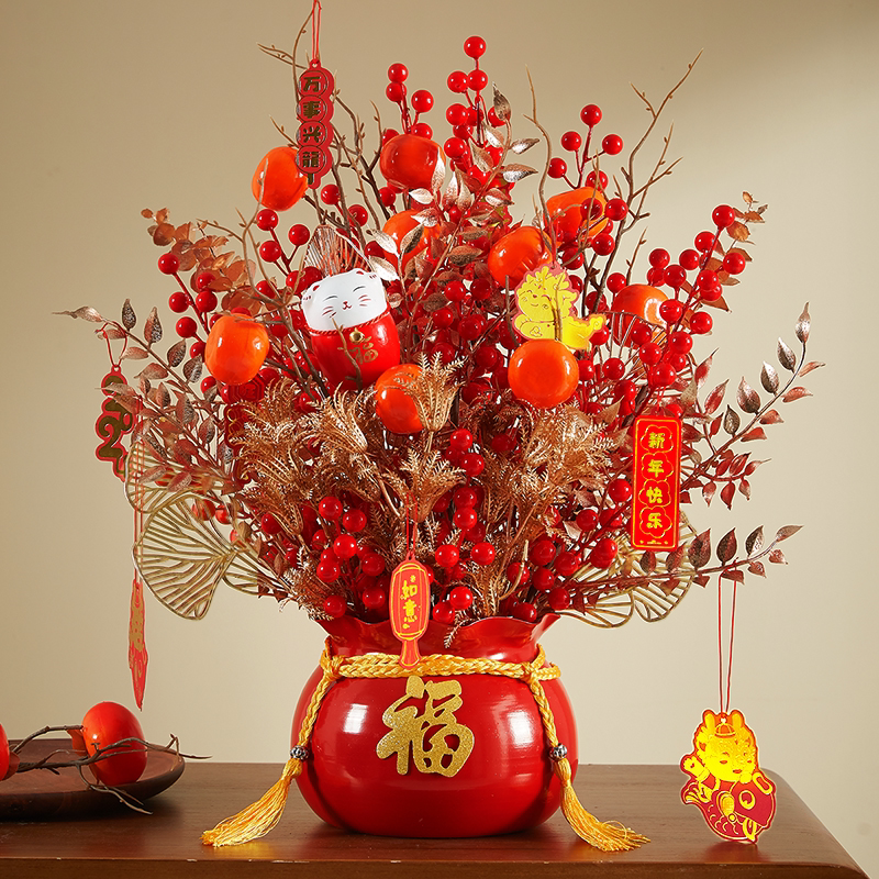 年宵花福桶发财果摆件过年乔迁之喜装饰用品新居布置红果仿真花