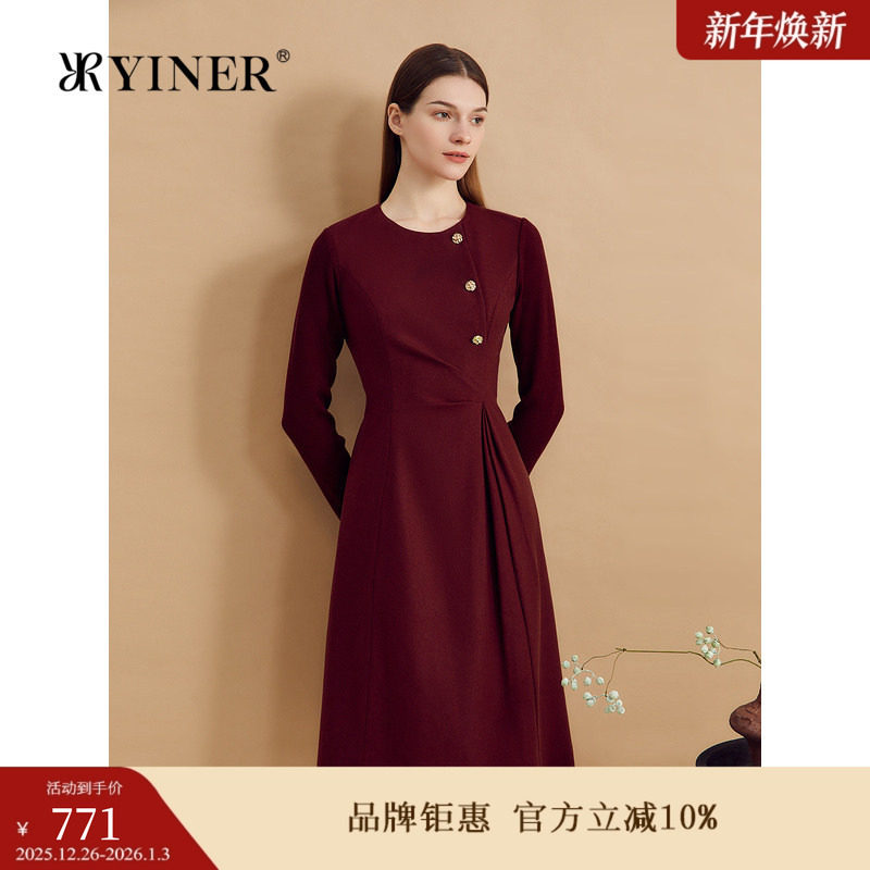 【中国红】YINER音儿专选冬季羊毛侧门禁捏褶收腰连衣裙