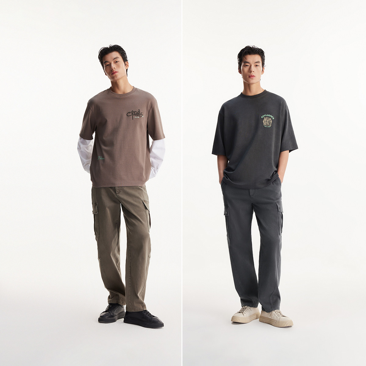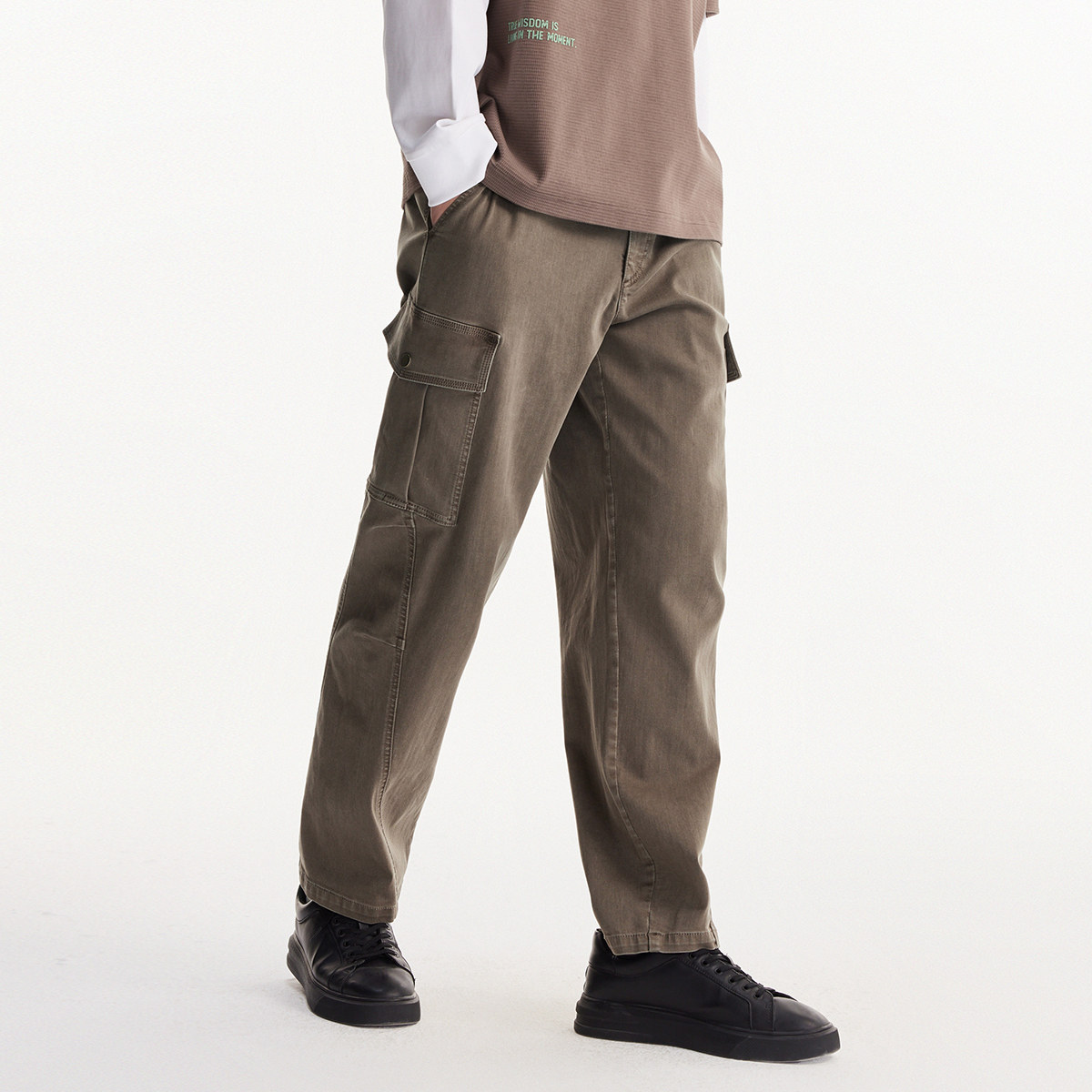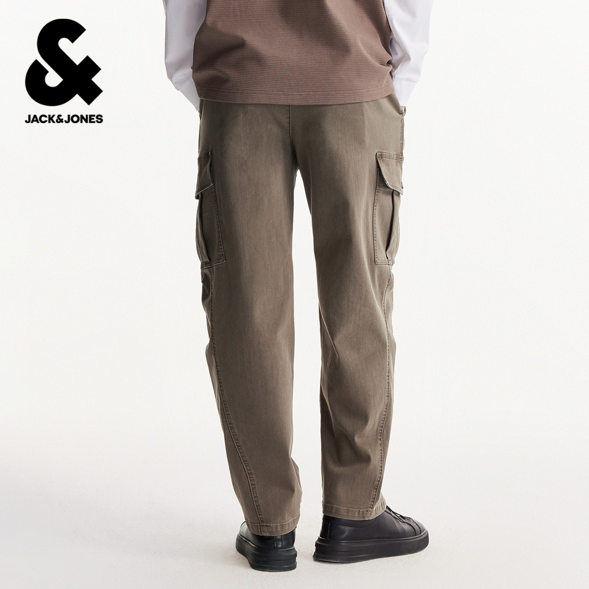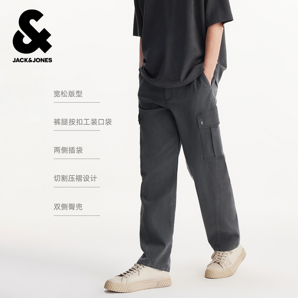 杰克琼斯男装春季休闲裤新款裤腿摁扣工装口袋简约切割压褶设计
