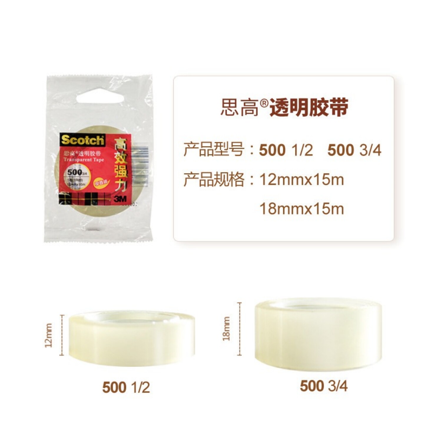 3M Scotch思高500透明胶带高效强力文具胶带12mm小胶纸18mm财务用品1.8cm学生玻璃胶办公胶带条不变黄15m批发