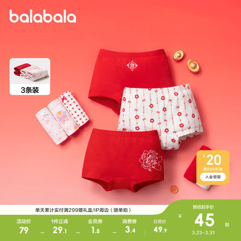 巴拉巴拉女童内裤平角棉本命年红色儿童短裤四角新年款三条装