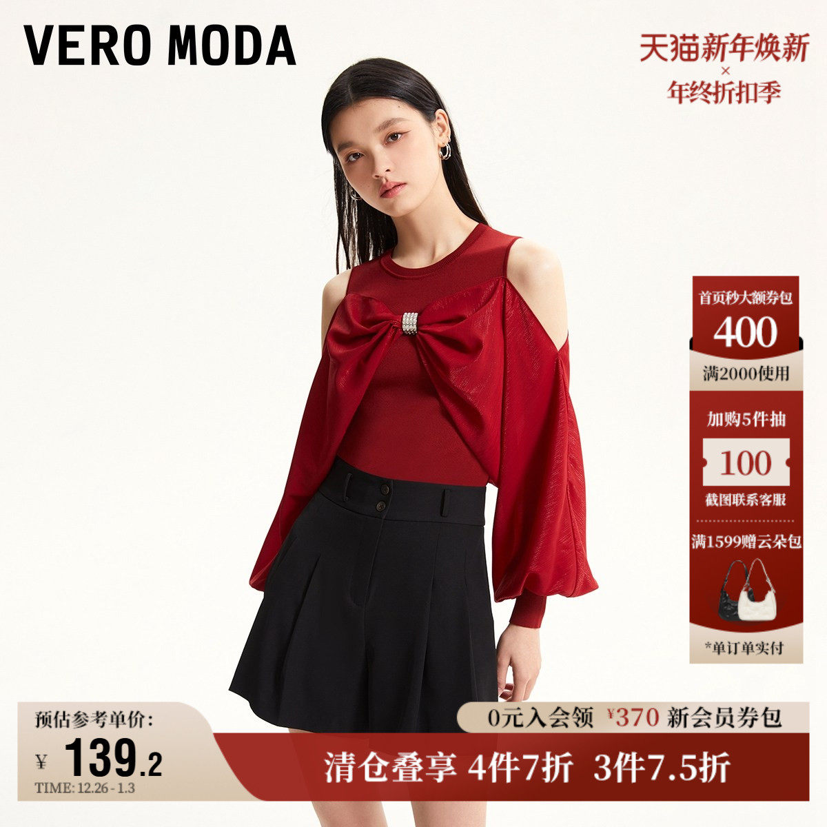 Vero Moda奥莱上衣女秋冬清仓优雅甜美蝴蝶结露肩修身针织衫百搭