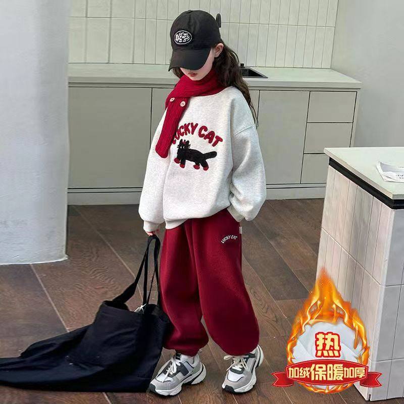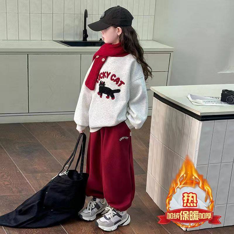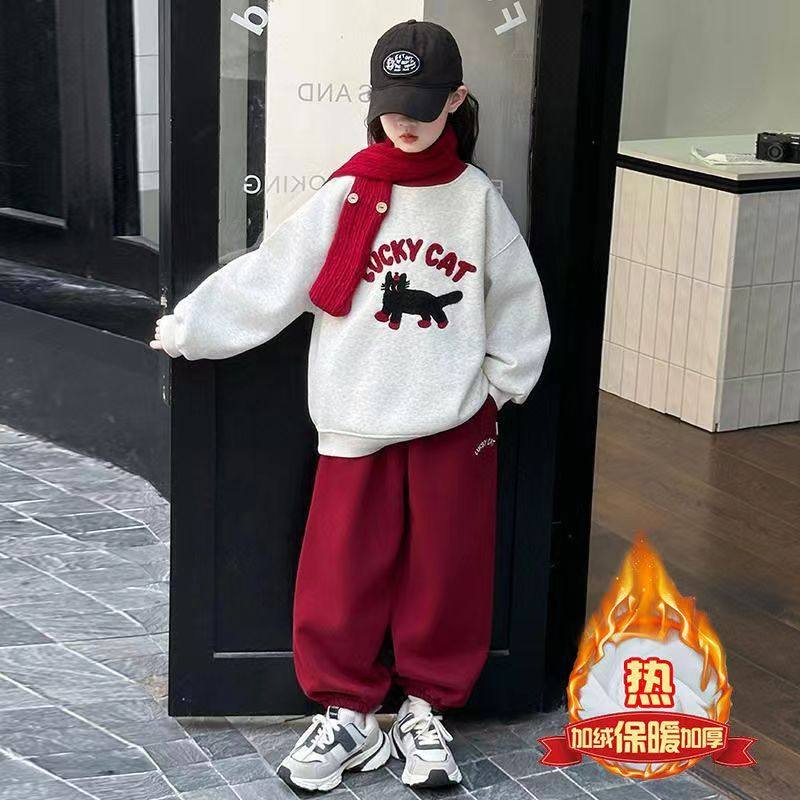 2025新款儿童加绒小猫卫衣中大童冬装休闲裤子两件套女童套装秋冬