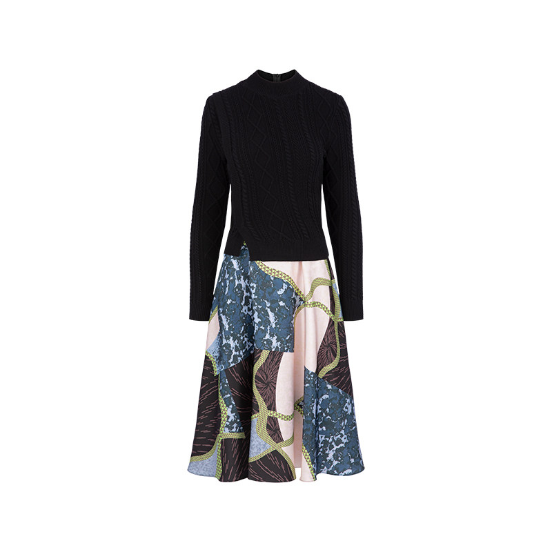 MARYLING玛俪琳秋冬新品黑粉色修身中长裙针梭拼接圆领印花连衣裙