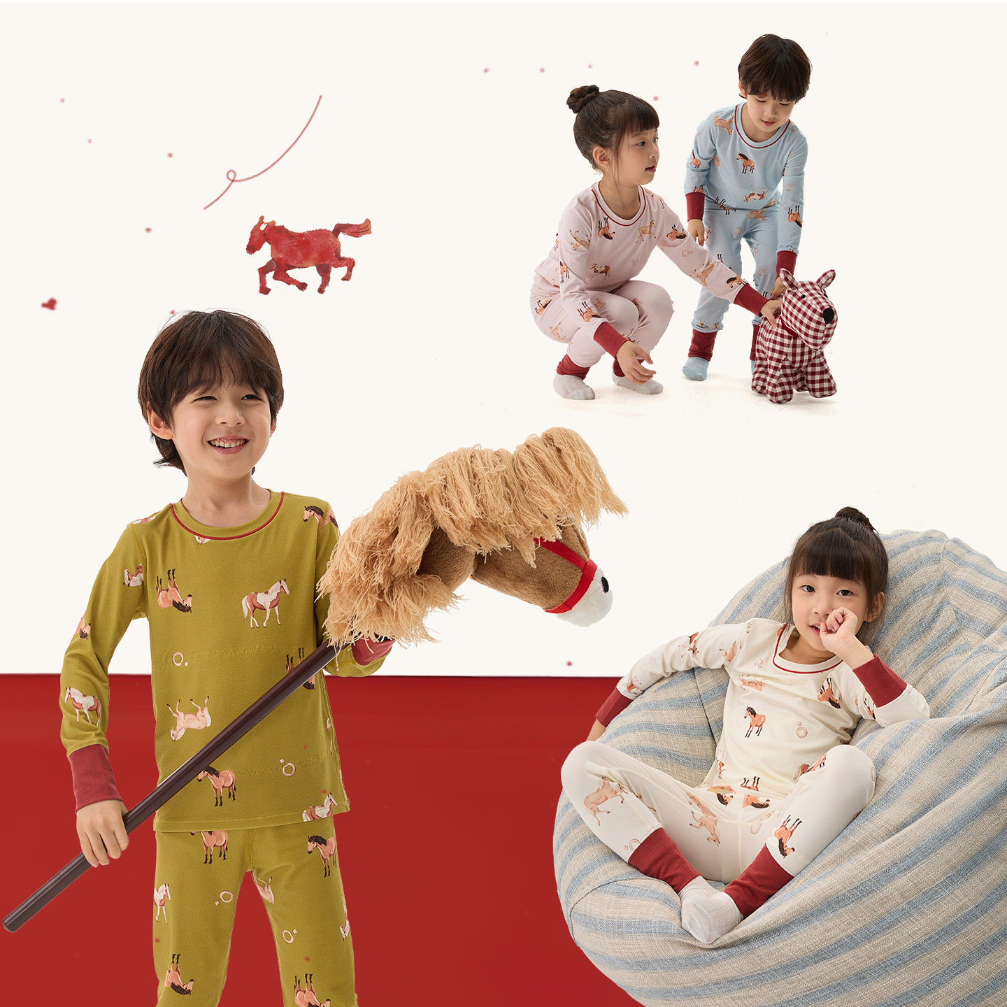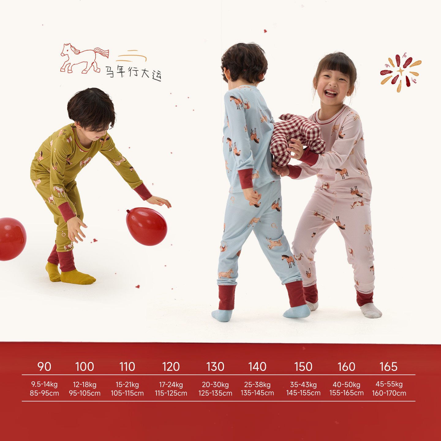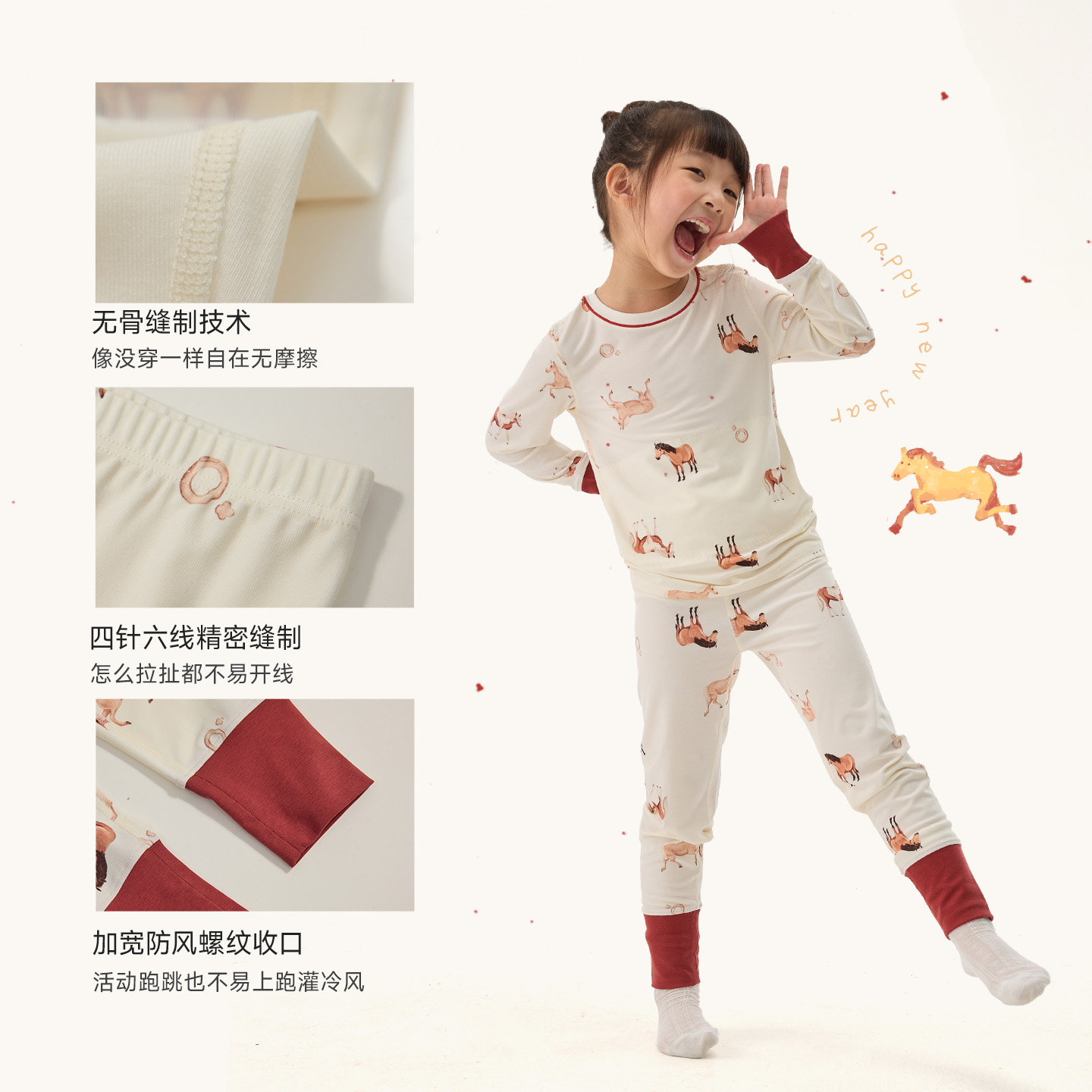 Q21纳福小马新年内衣套装男女童排汗抑菌天丝莫代尔内衣A类家居服