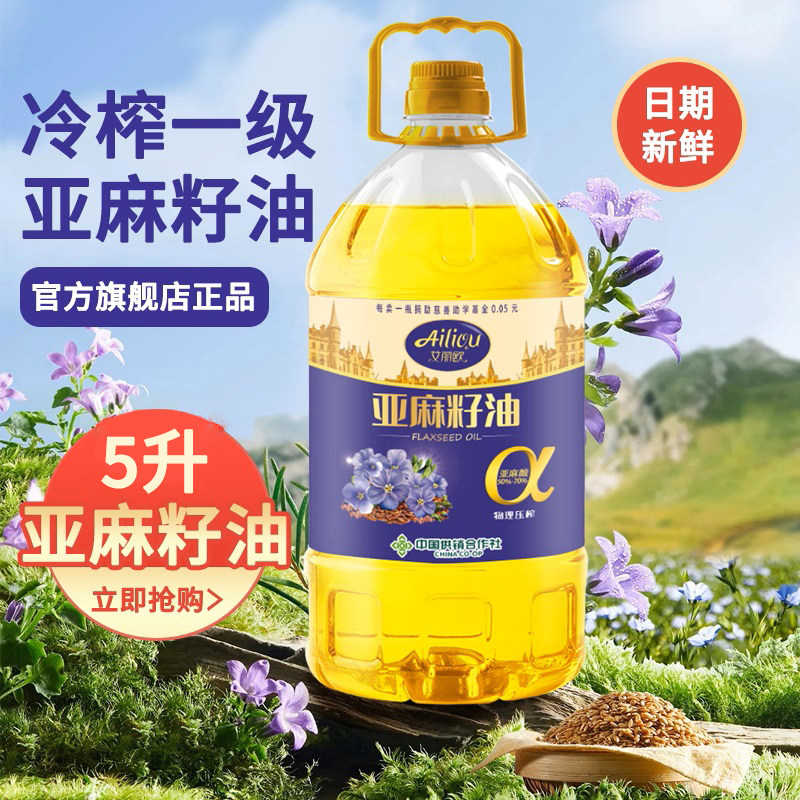 艾丽欧物理冷榨亚麻籽油5L桶装家用凉拌食用油植物油官方旗舰店